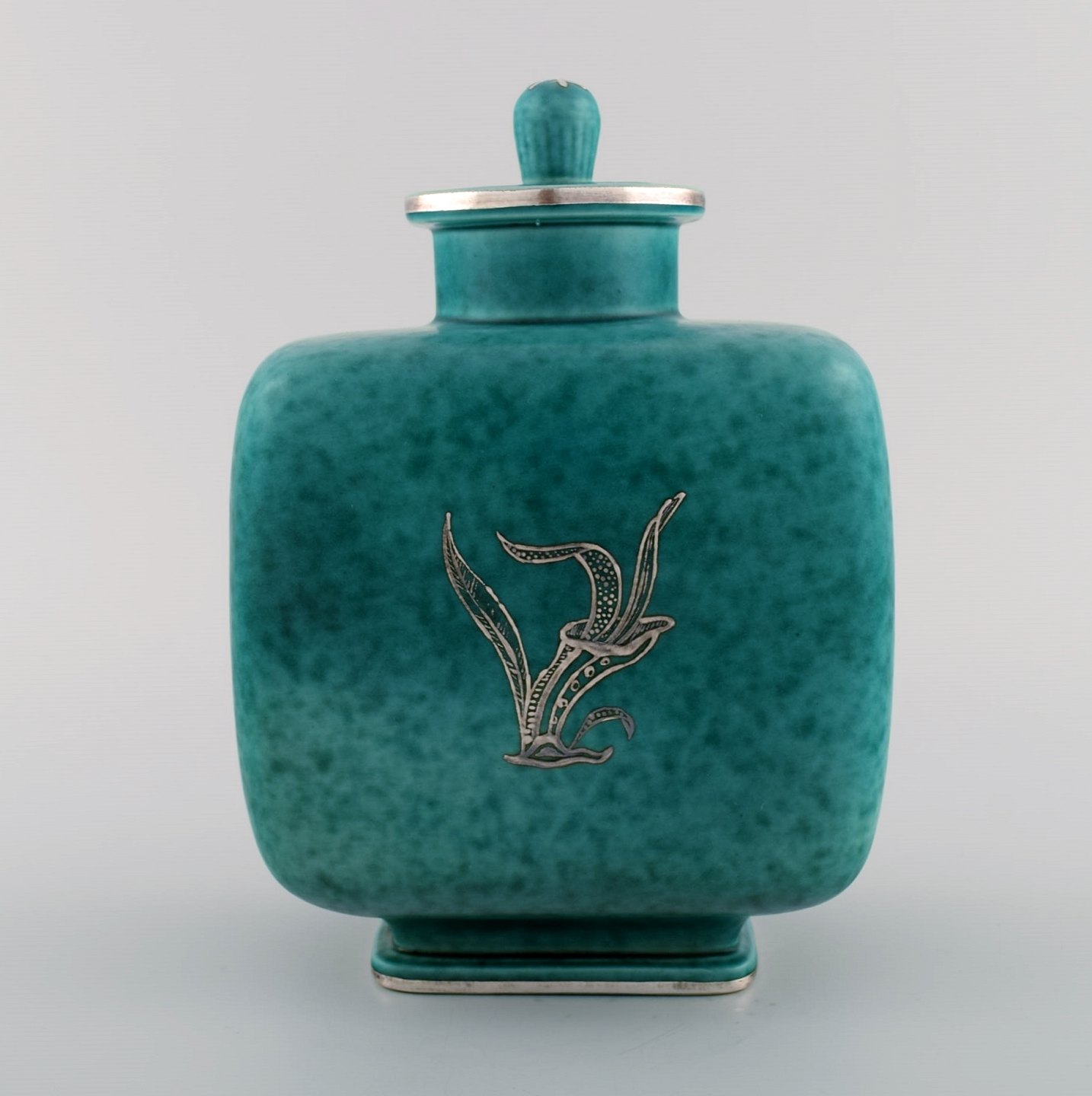 Wilhelm Kåge for Gustavsberg. Argenta art deco lågkrukke i glaseret keramik dekoreret med nøgen kvinde i sølvindlæg.