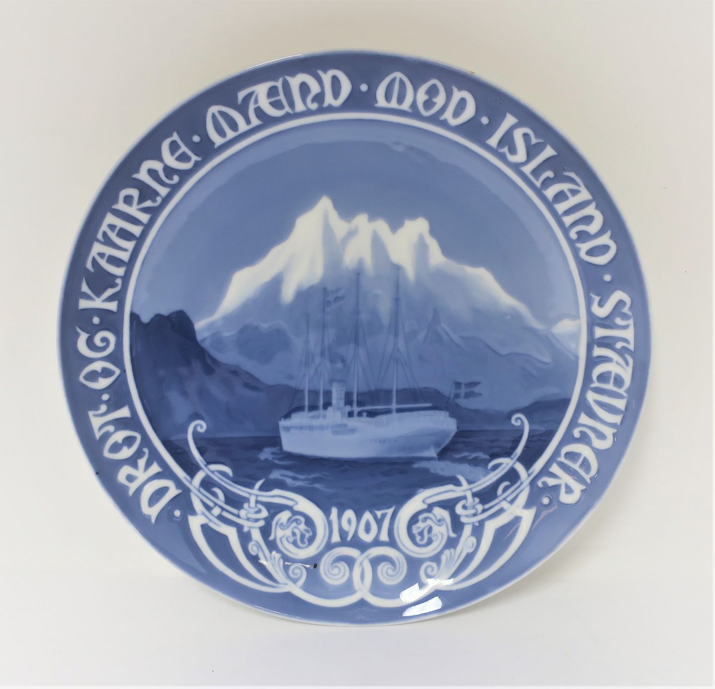 Bing & Grøndahl. Mindeplatte 1907. Kongeskibet ved Islands turen i 1907. Diameter 23 cm.