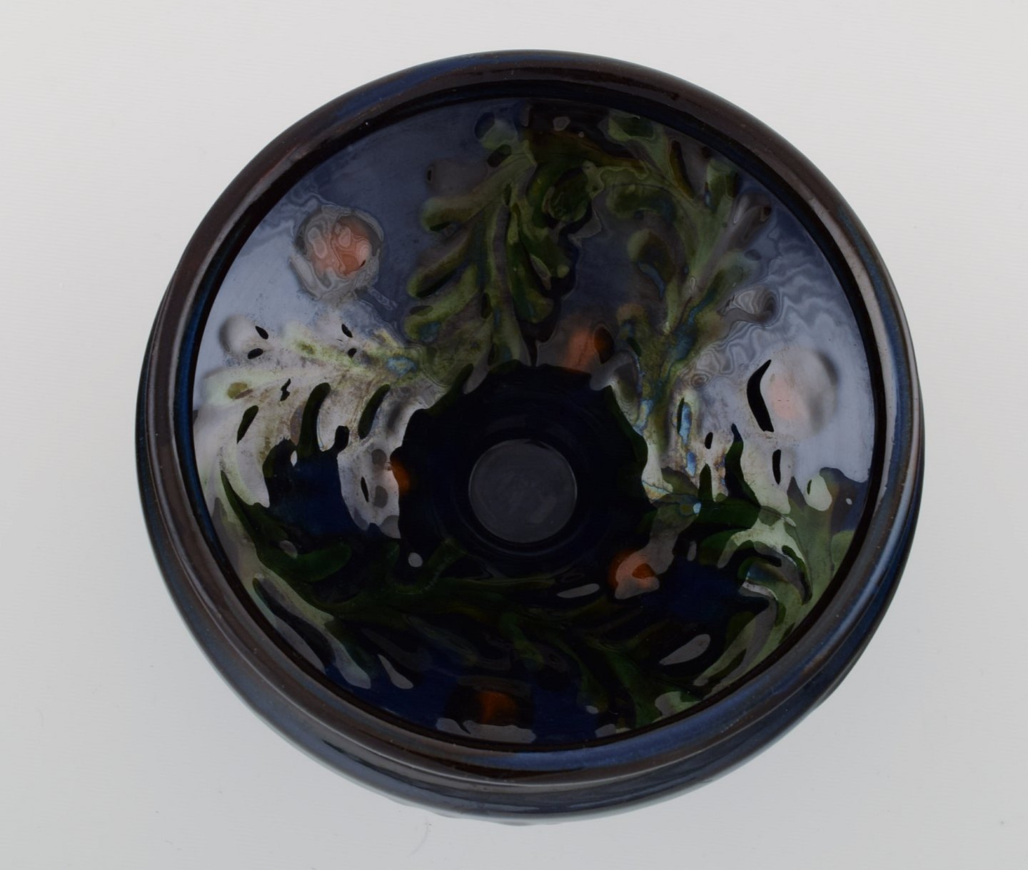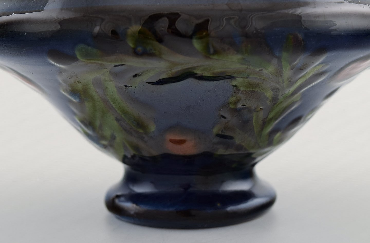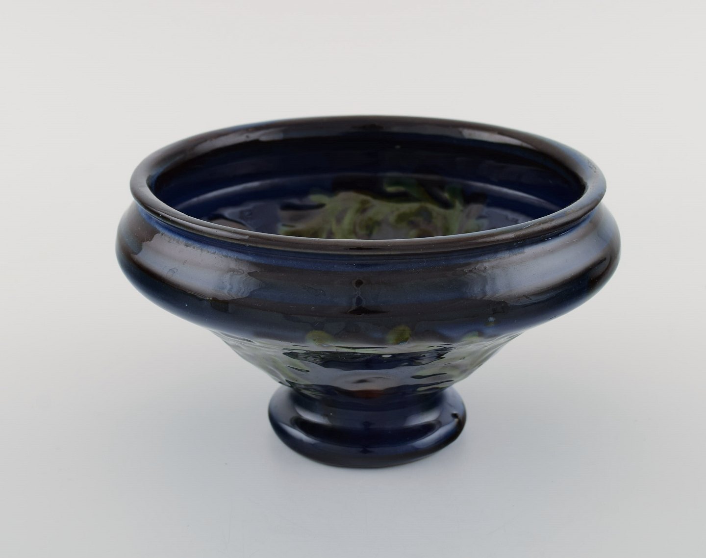 Kähler, HAK. Skål i glaseret keramik. Grønne blade og røde bær på mørkeblå baggrund. 1930/40'erne.