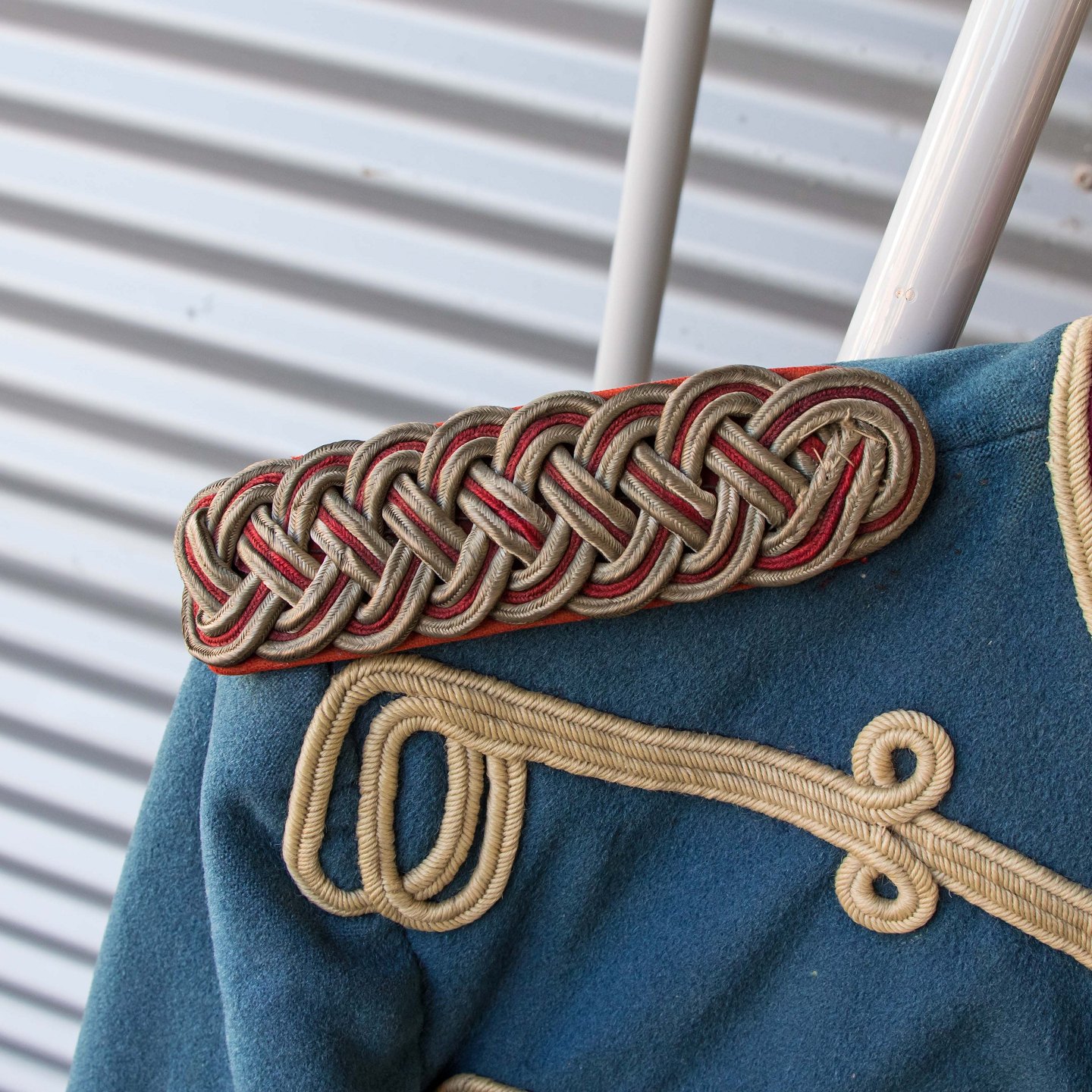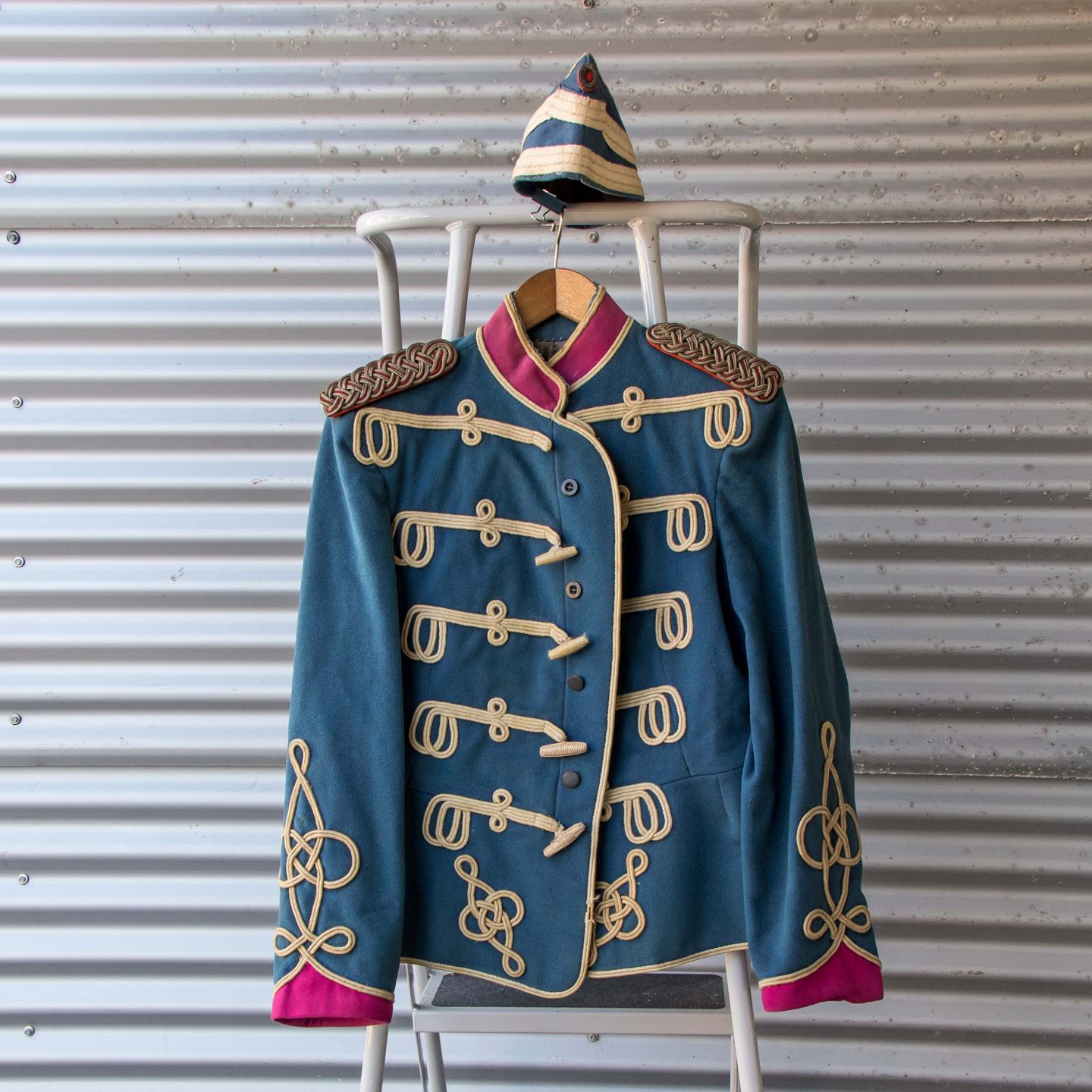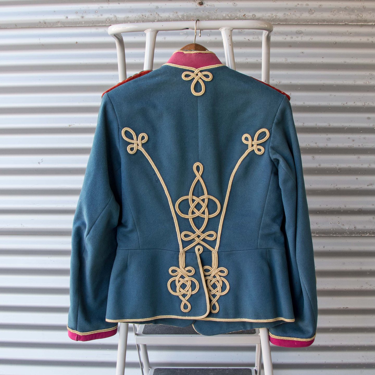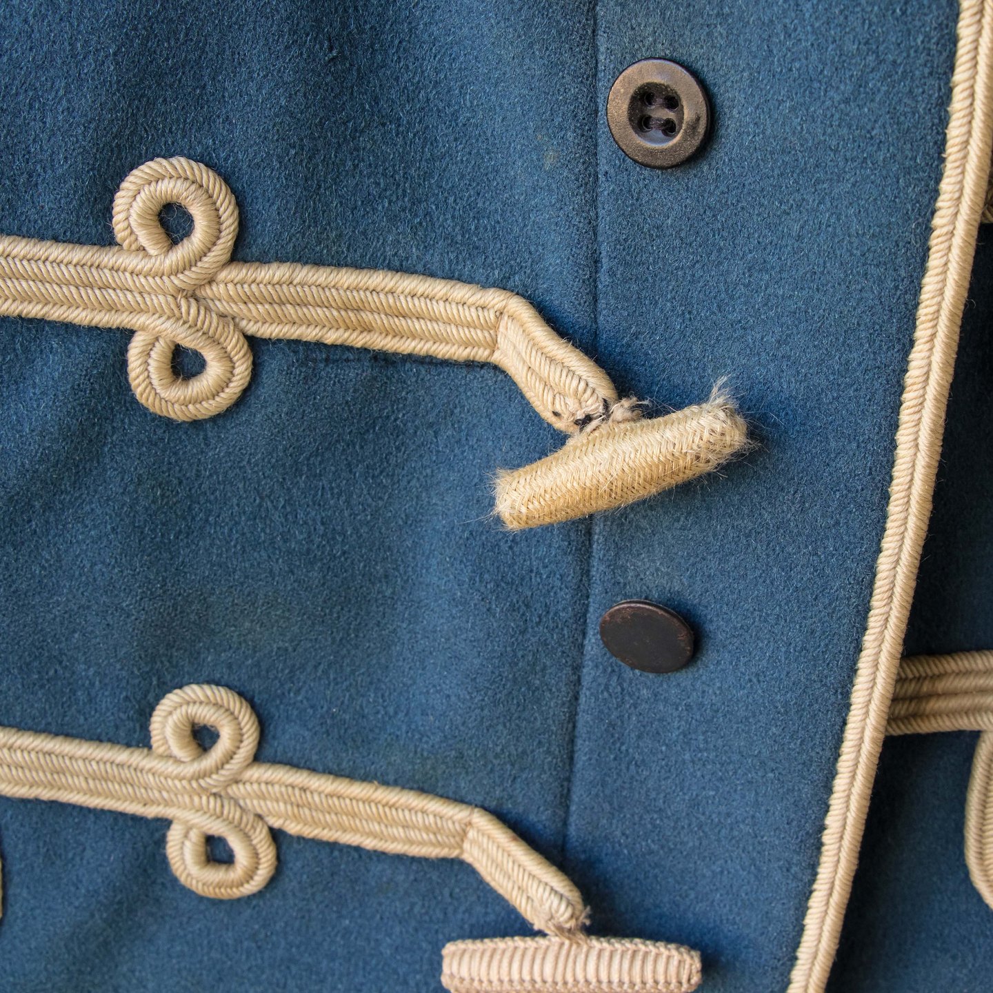 Antik uniform i blå stof og lilla krave samt ærme fra Bornholms Værn regiment fra år 1903. Bornholmsværn var oprindelig Gardehusar