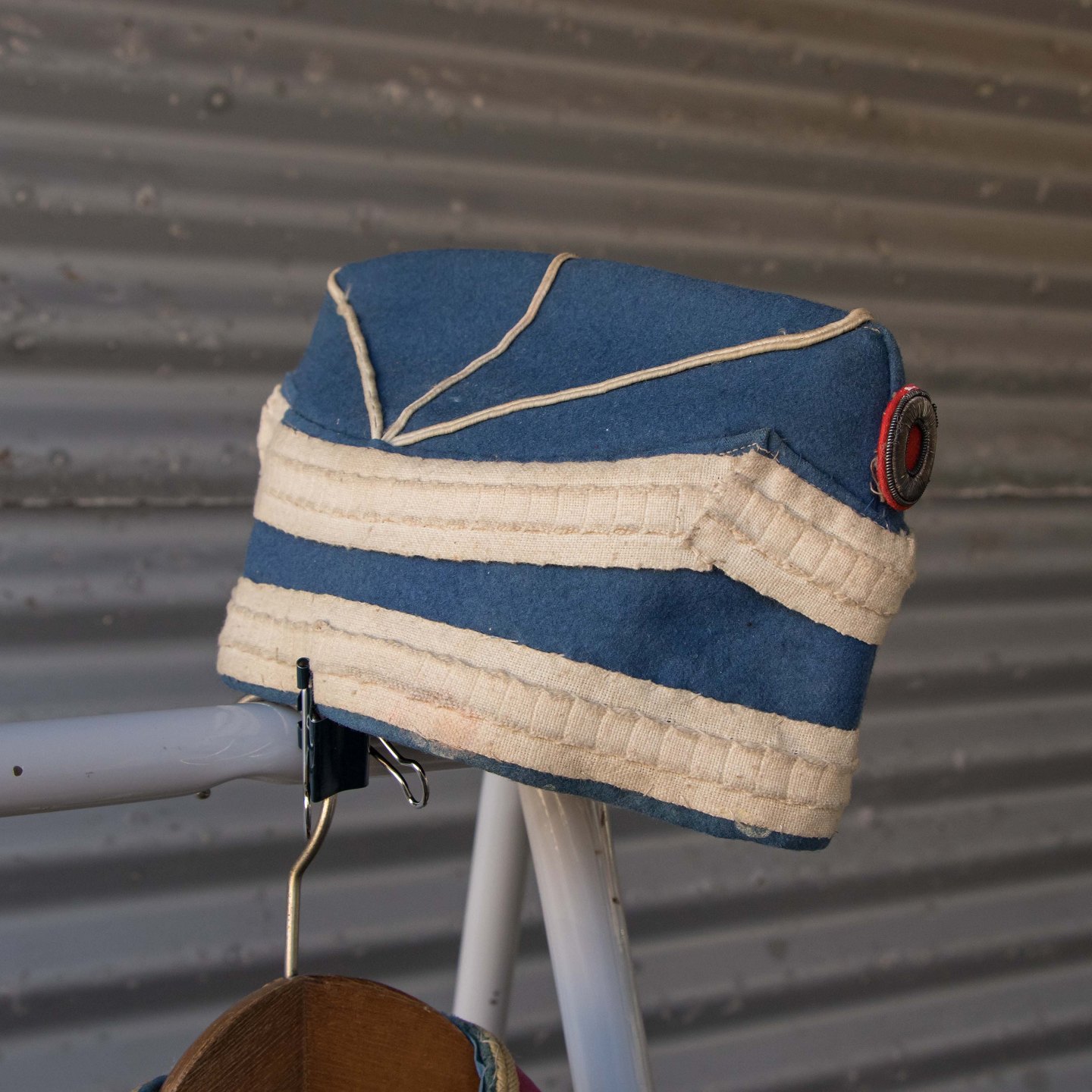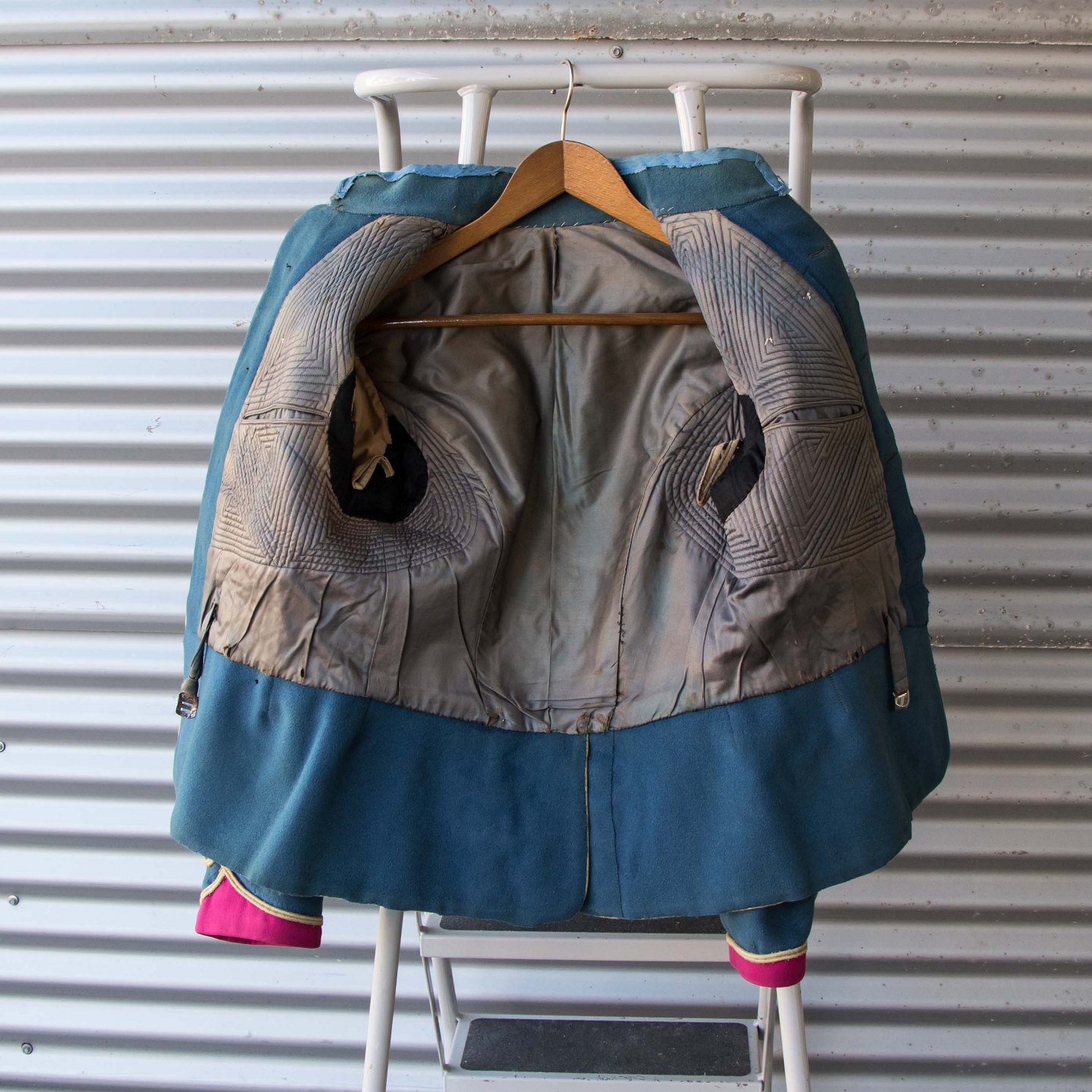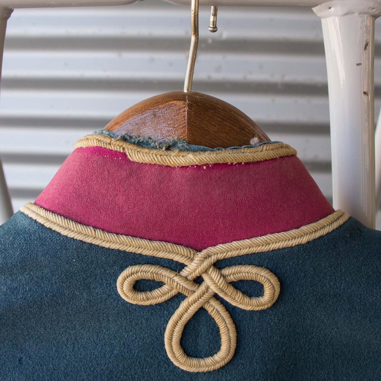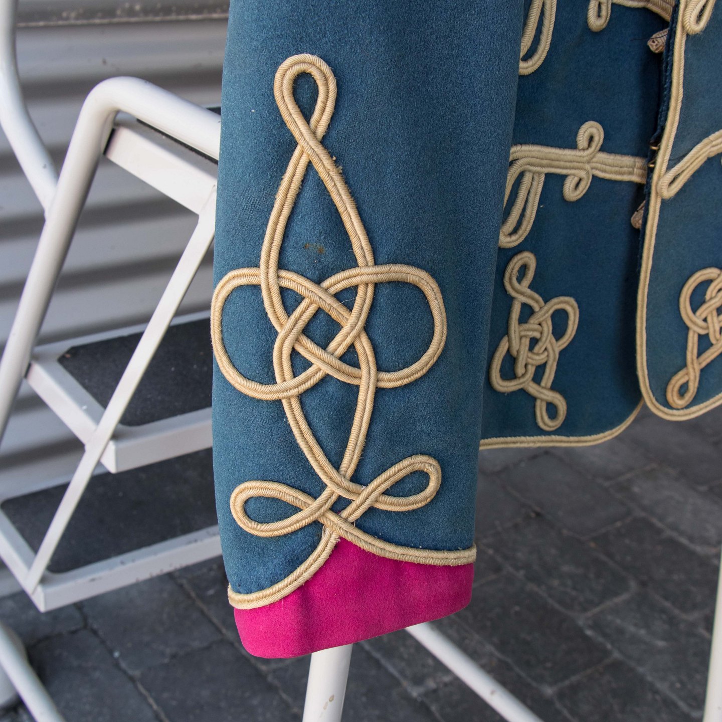 Antik uniform i blå stof og lilla krave samt ærme fra Bornholms Værn regiment fra år 1903. Bornholmsværn var oprindelig Gardehusar
