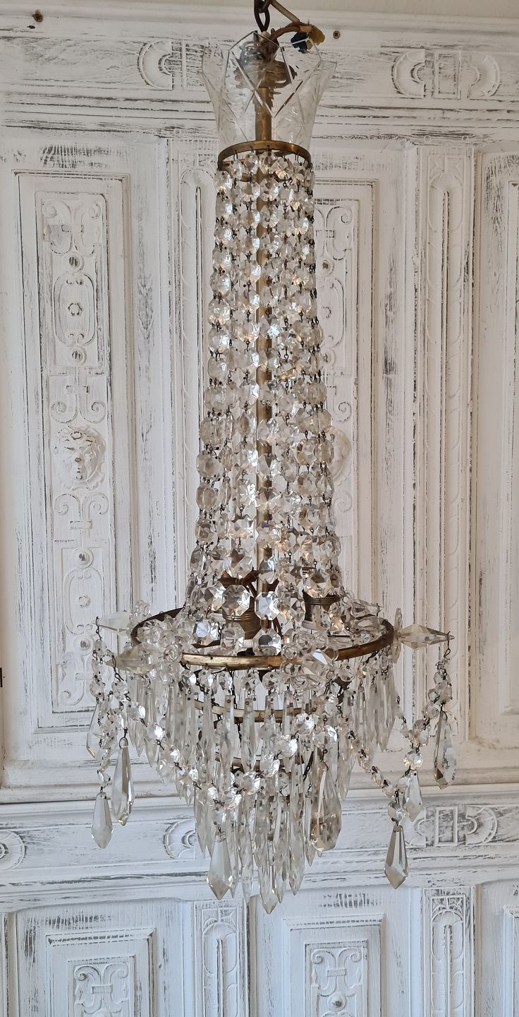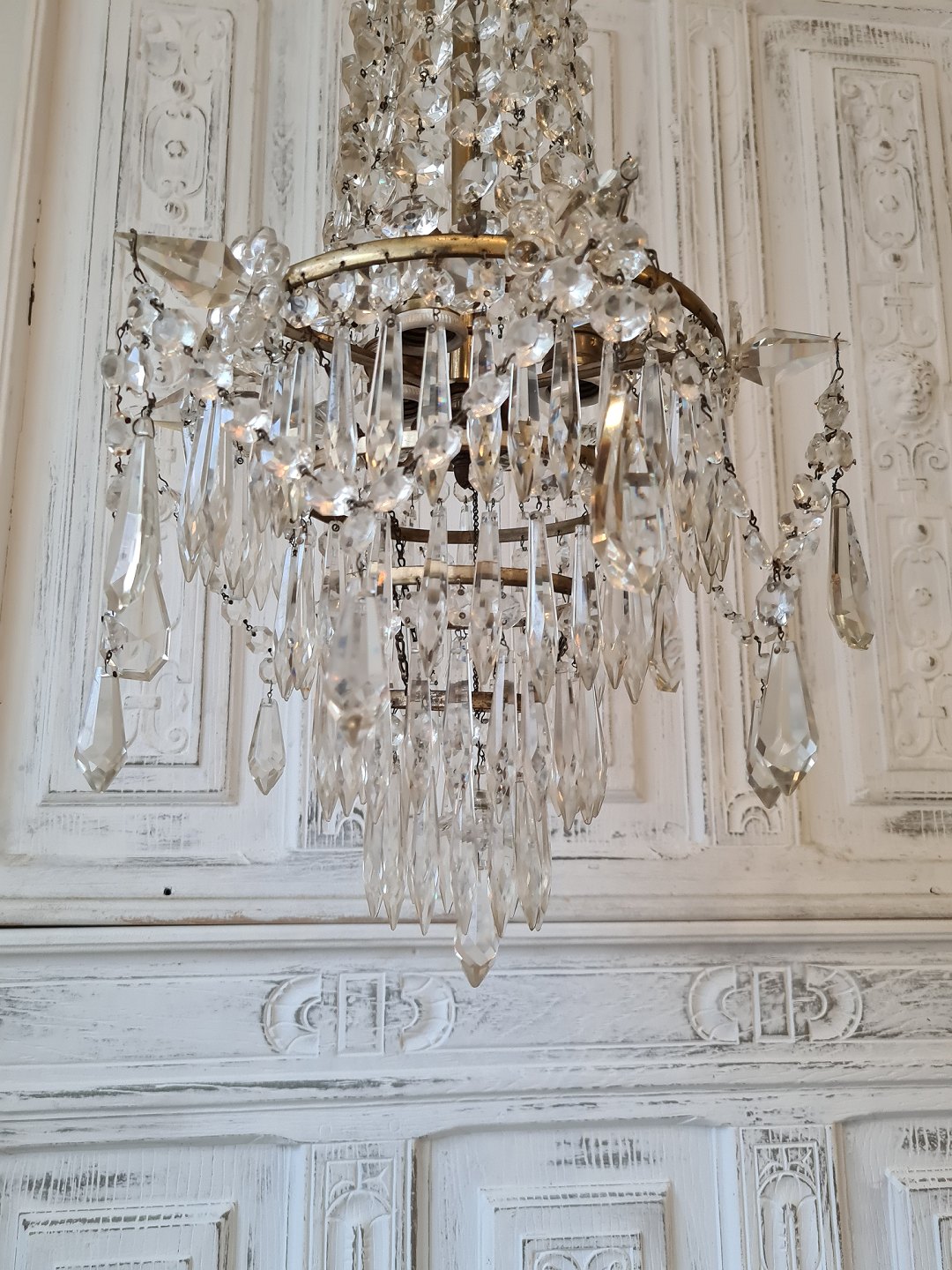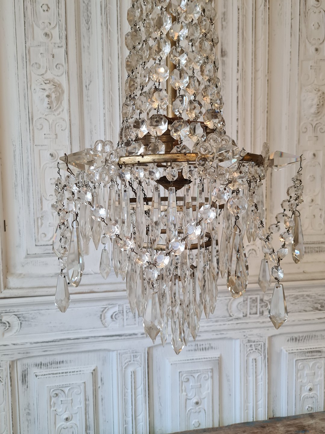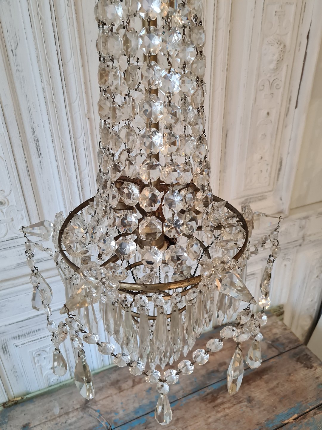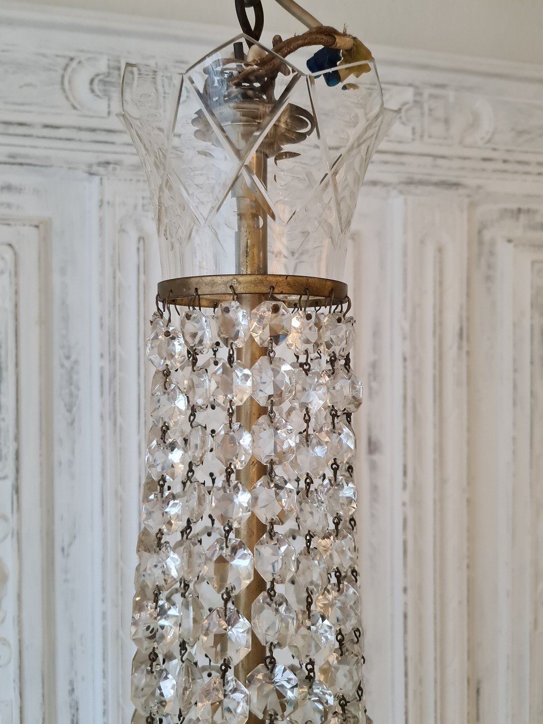 Stor smuk gammel prismelysekrone med tre lyskilder.