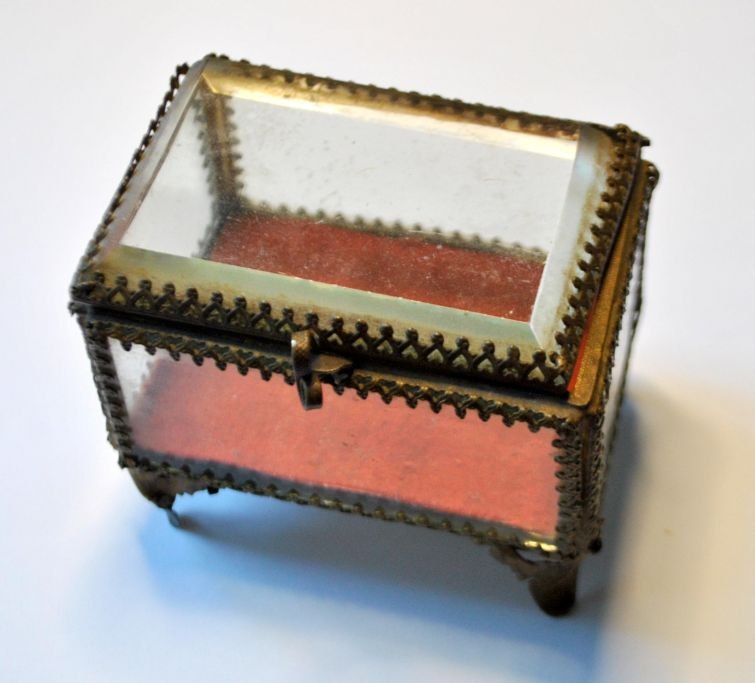 Smykkeskrin ca. 1900. Frankrig. Med facetteret glas og dekoreret messing rammer og fire ben. 6,5 x 5,5 x 8 cm.