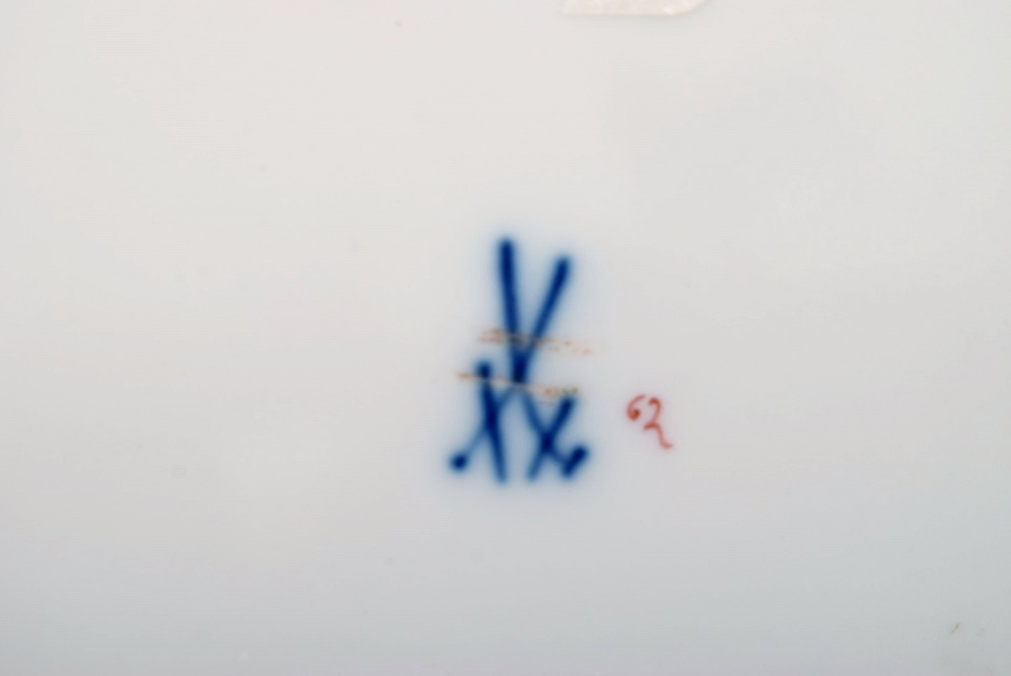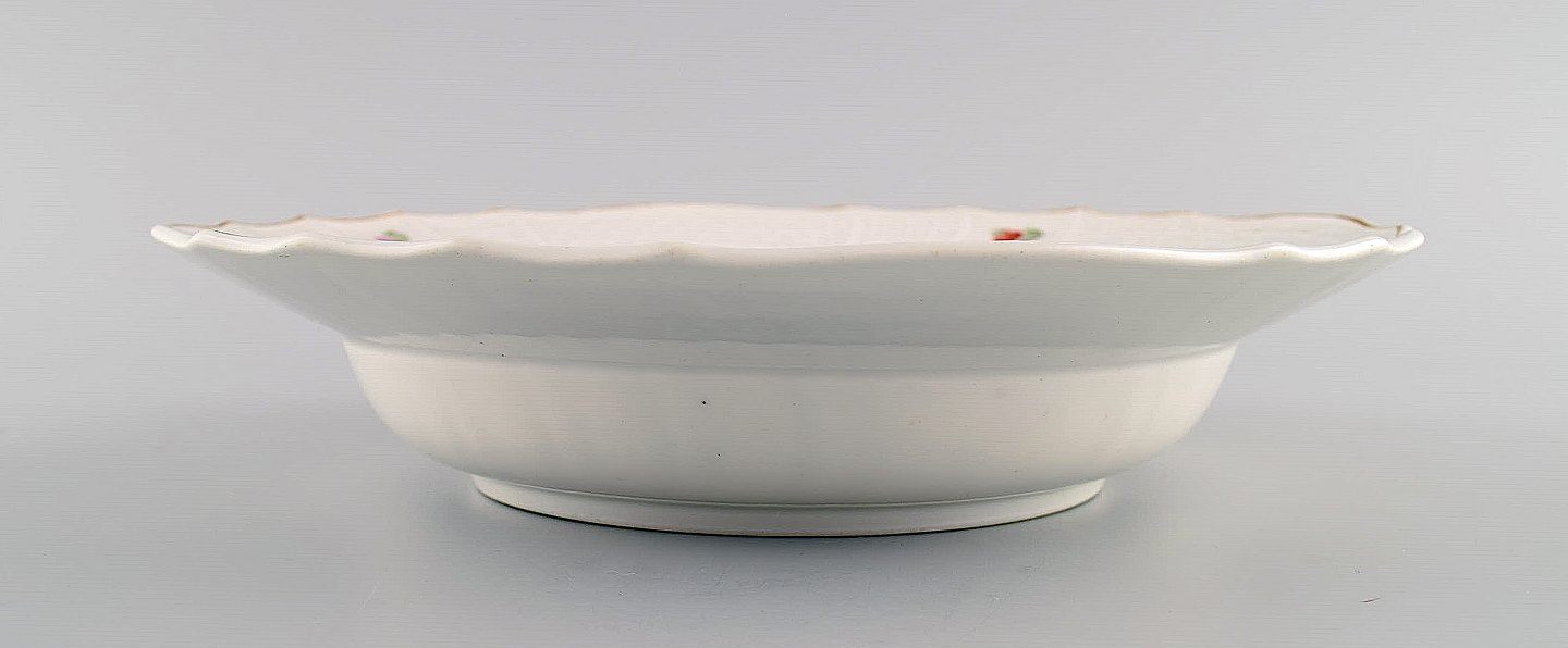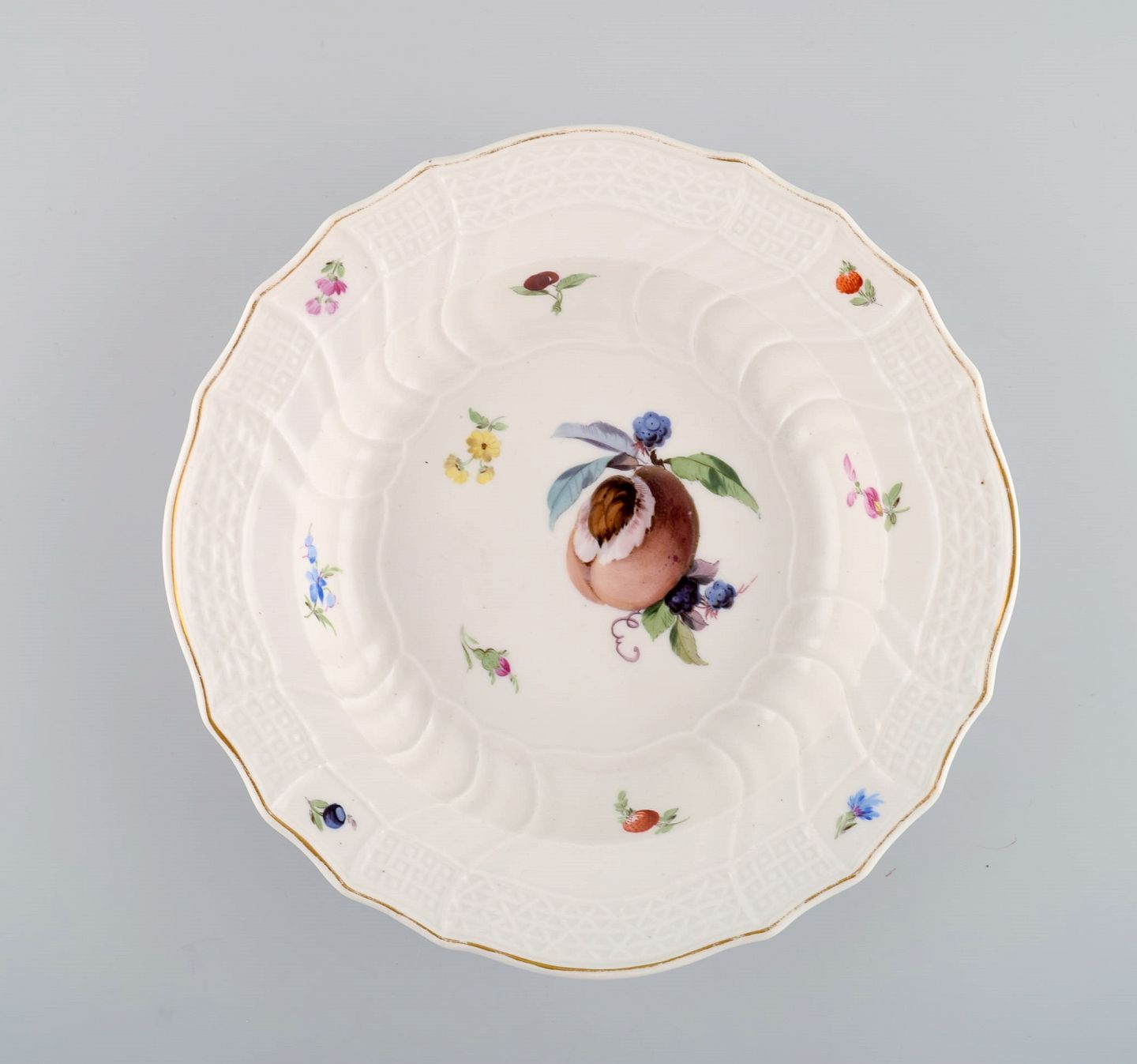 Antik Meissen dyb tallerken i håndmalet porcelæn med fersken og blomster. 1800-tallet.