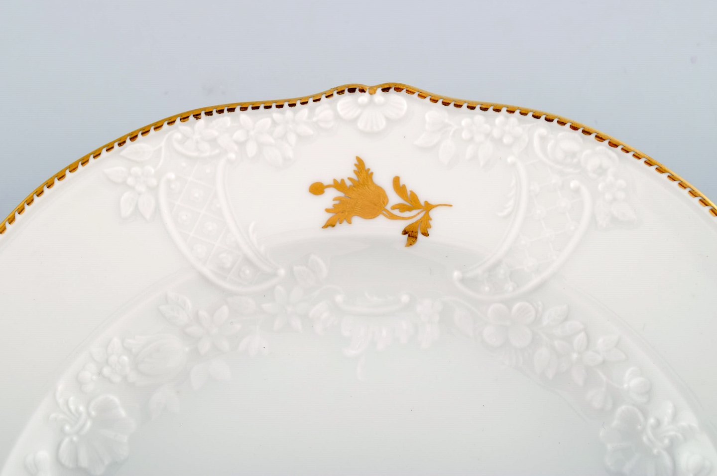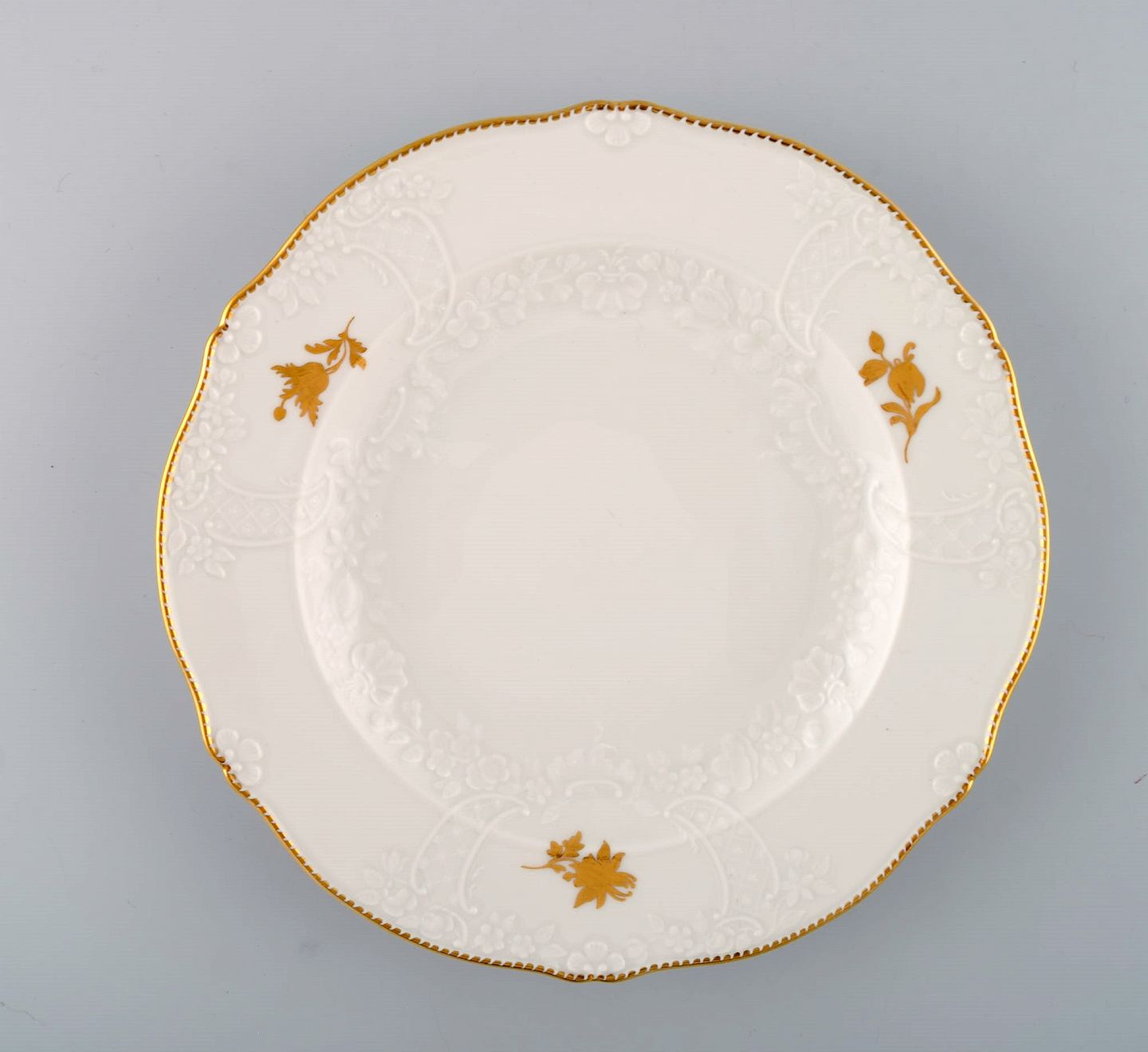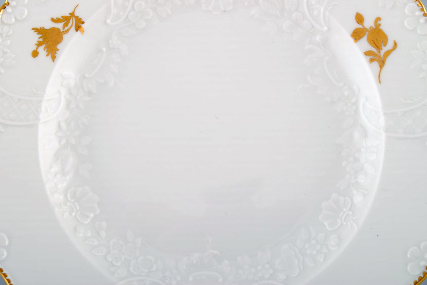 Text zugänglich auf Dänische: Meissen frokosttallerken i porcelæn med blomster og bladværk i relief og gulddekoration. 1900-tallet.