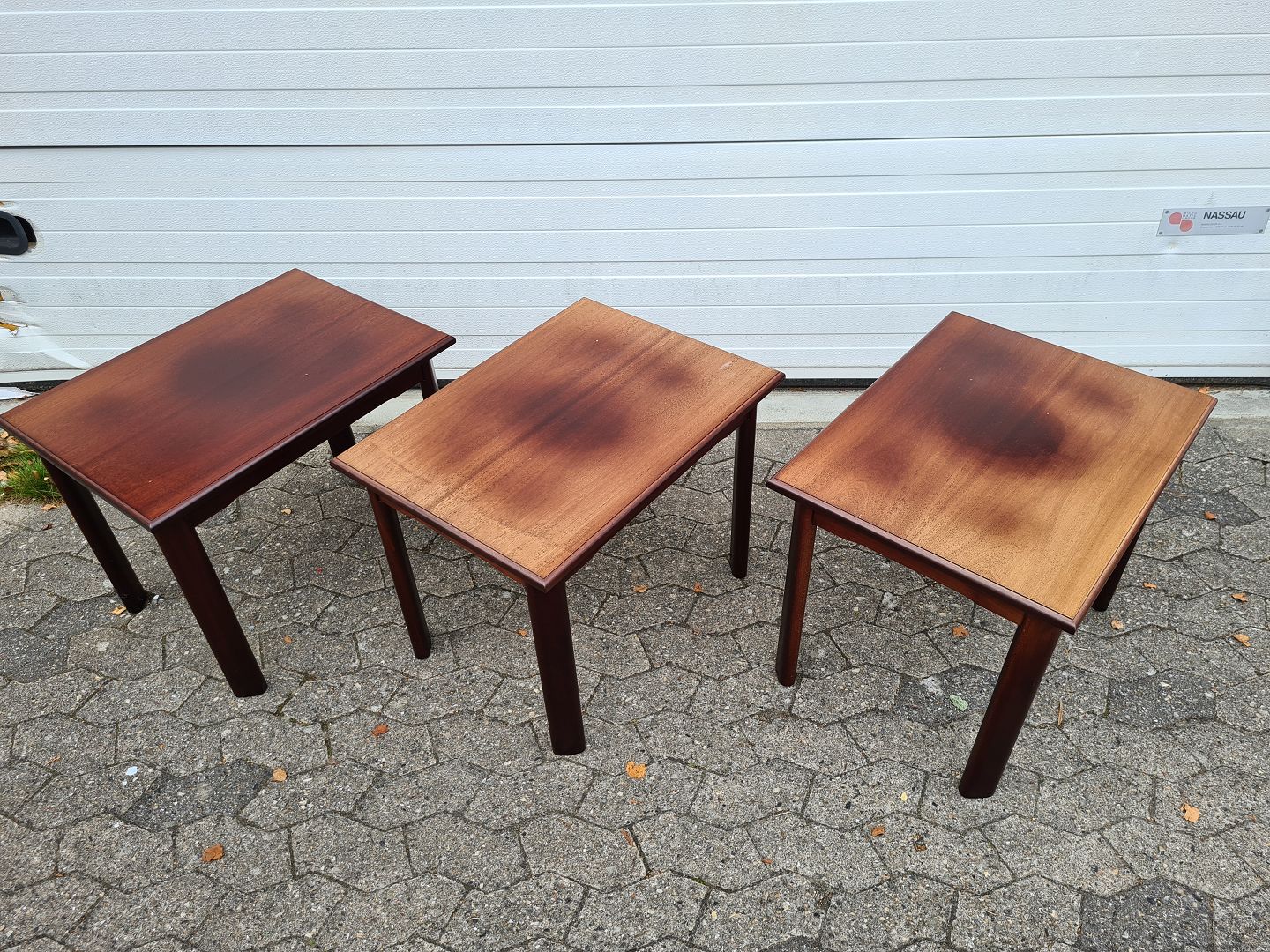 3 identiske lampeborde i mahogni. 1990´erne. Lettere solblegede.