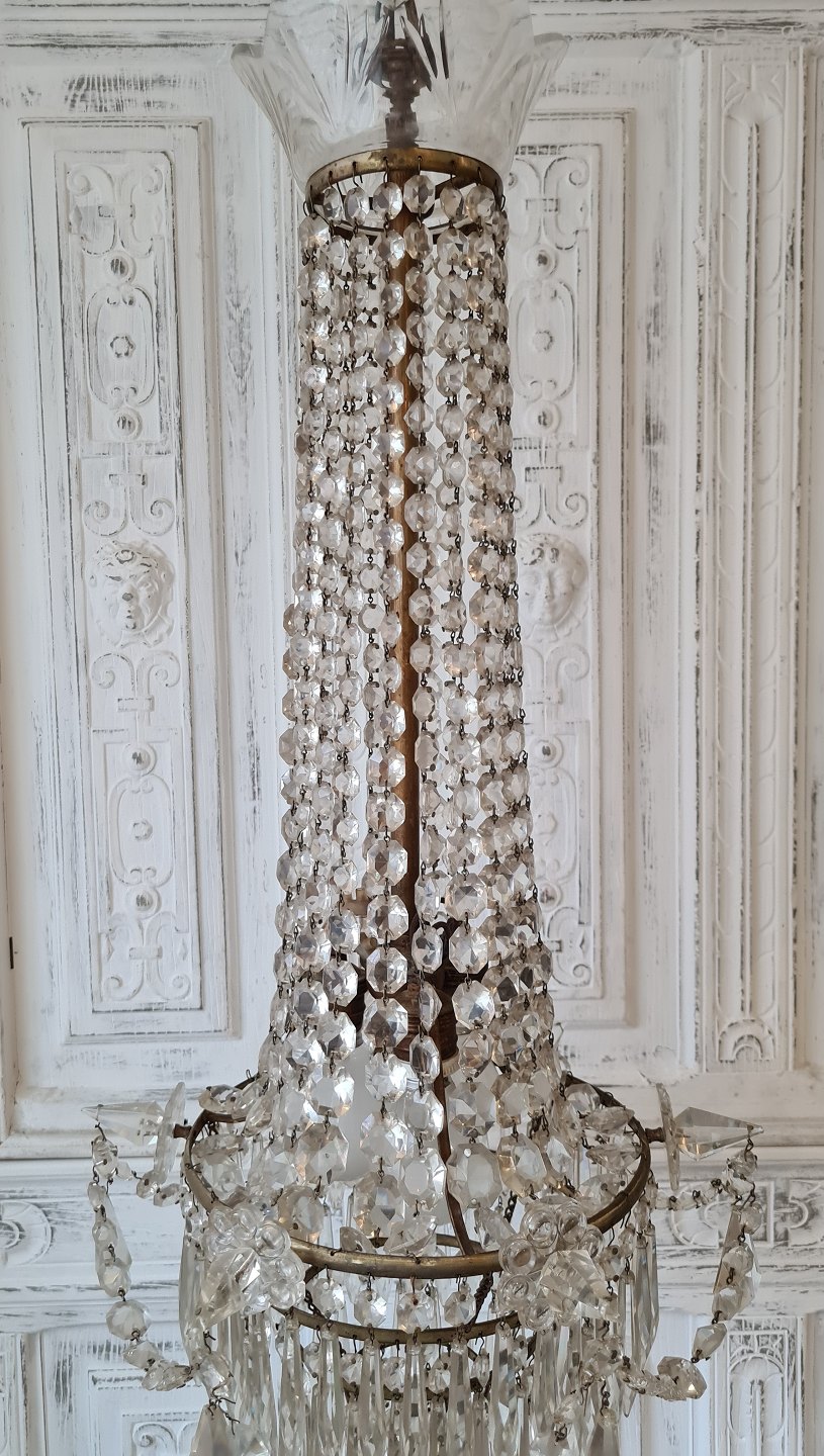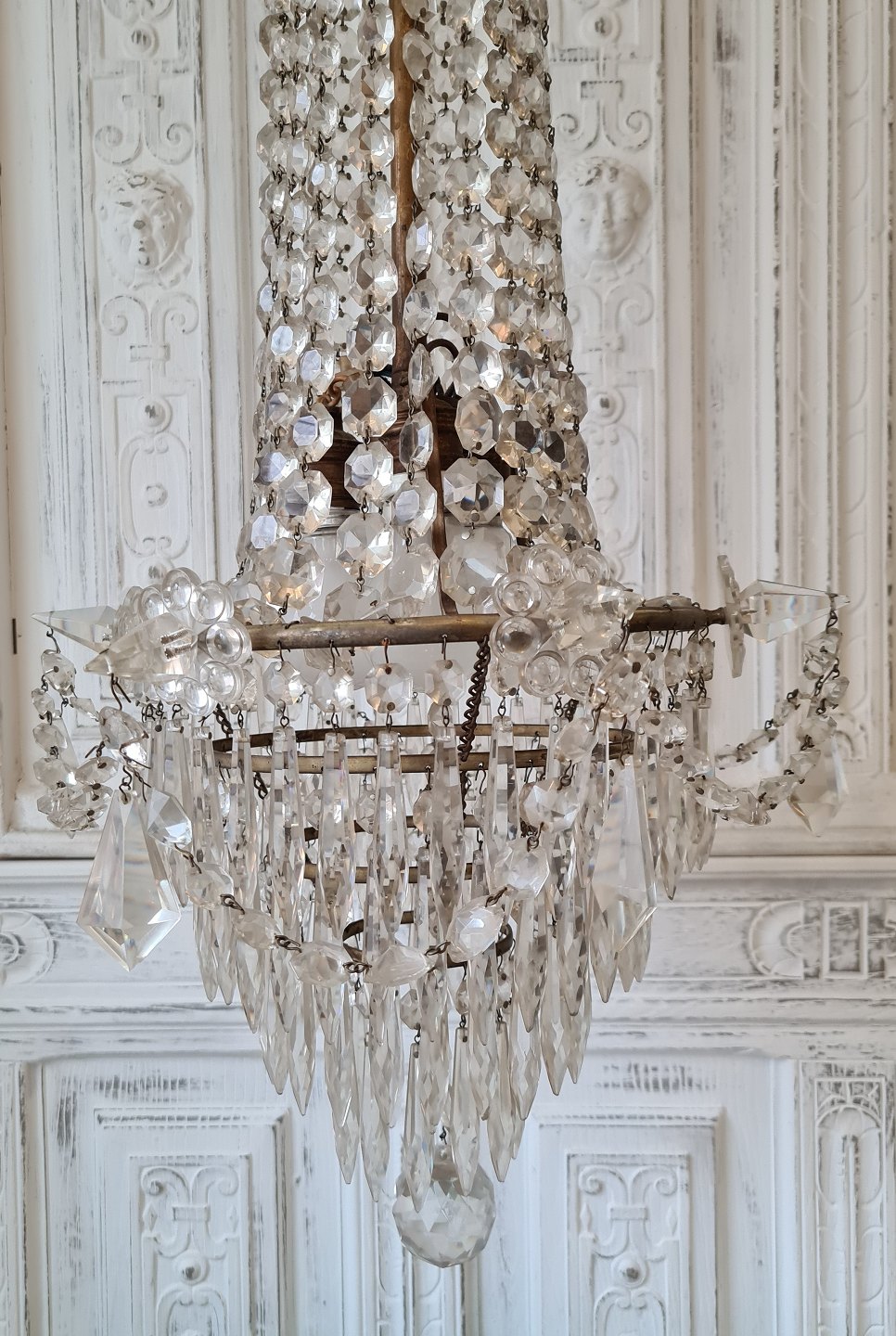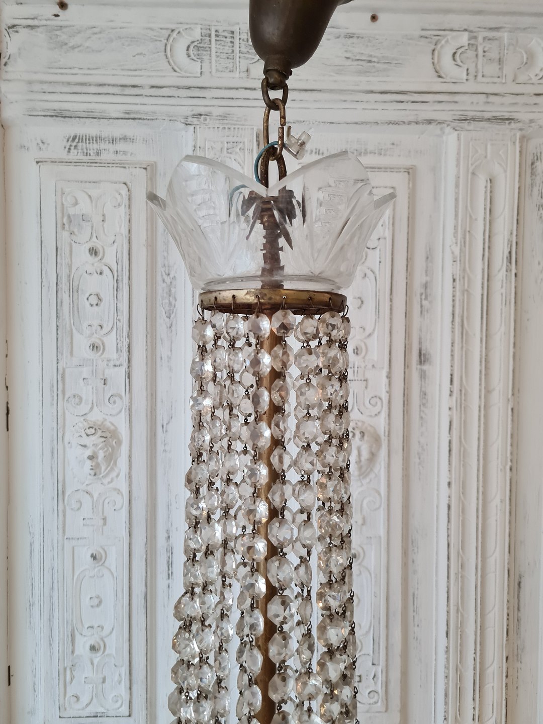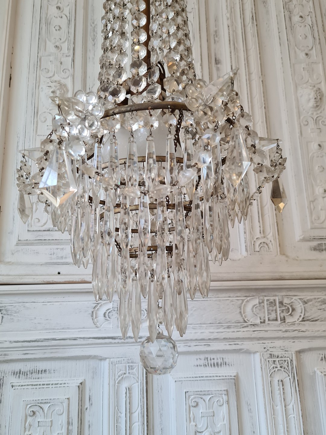 Stor smuk gammel prismelysekrone med tre lyskilder.