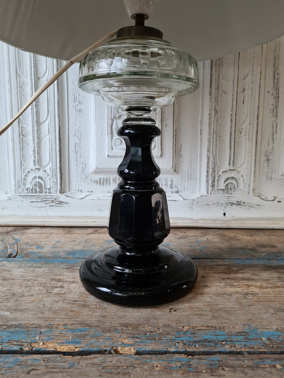 Smuk 1800tals sort opaline lampe med oliebeholder i klart glas med olivenslibninger.