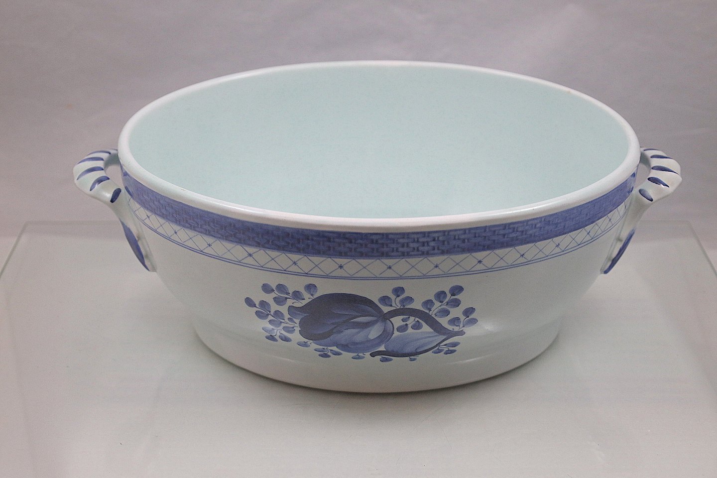 Glat hvid fajance med blå dekoration af blomster og blå bort