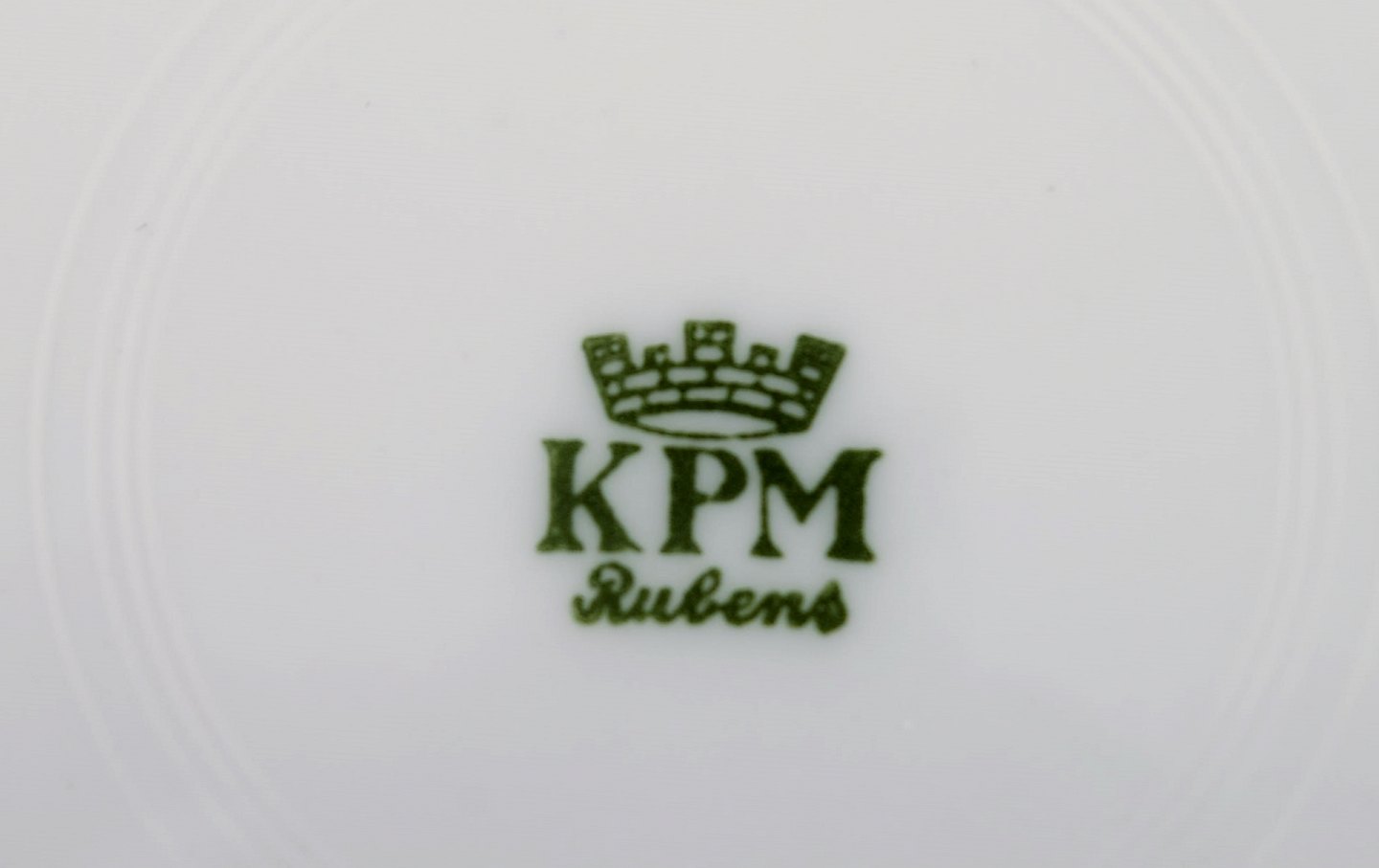 KPM, Kjøbenhavns Porcelæns Maleri. 11 Rubens frokosttallerkener i porcelæn med blomstermotiver, guldkant og snirkler i relief. 1940'erne.
