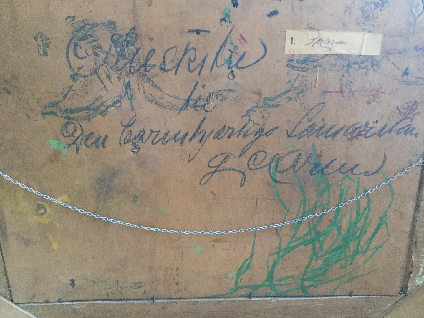 Bagpå - Olieskitse til Den Barmhjærtige Samaritan - L.C. Larsen samt udstillingsmærkat fra KE.