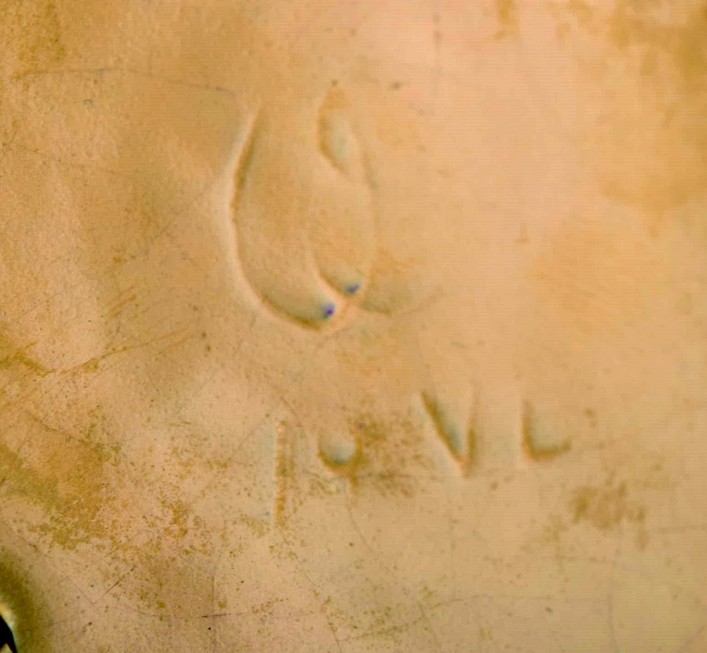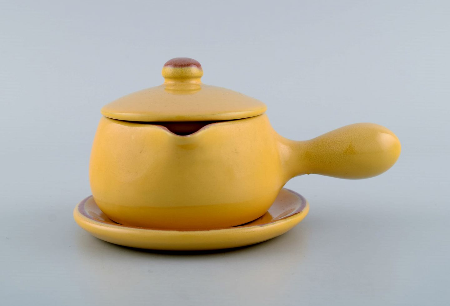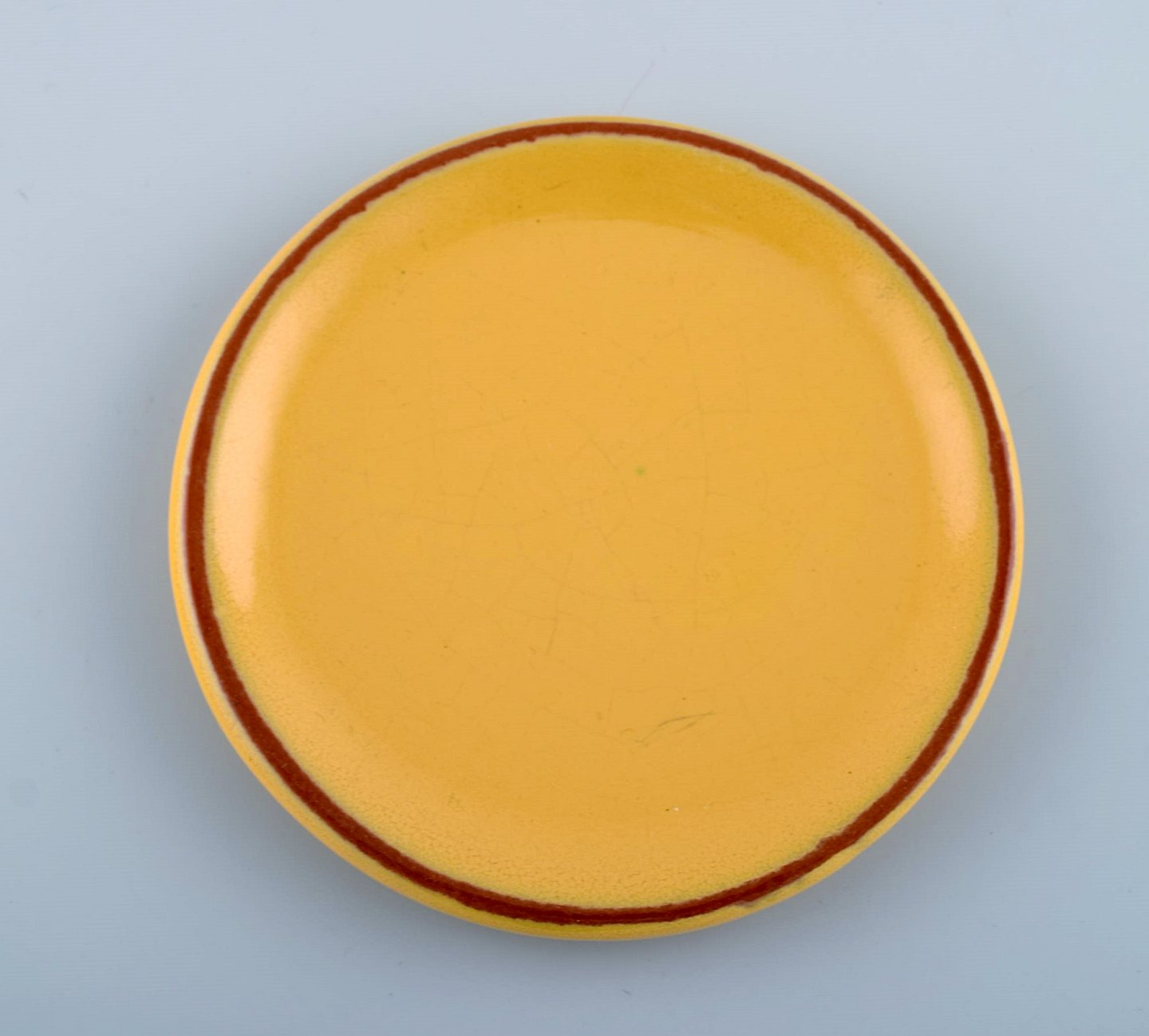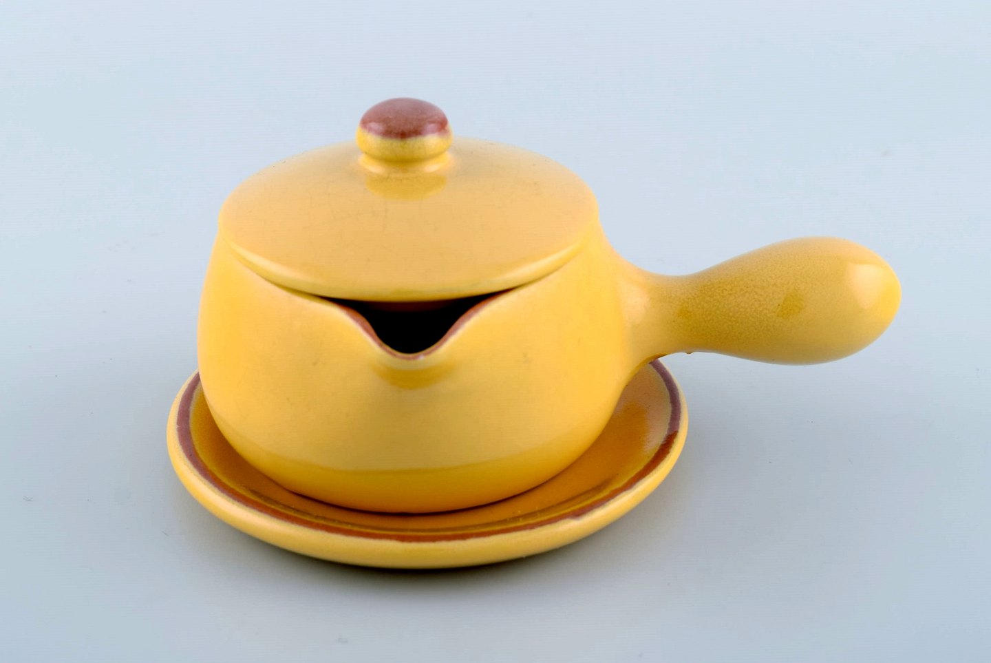 Vicke Lindstrand for Upsala Ekeby. Sovsekande på underfad i glaseret stentøj. Smuk gul glasur. 1950'erne.