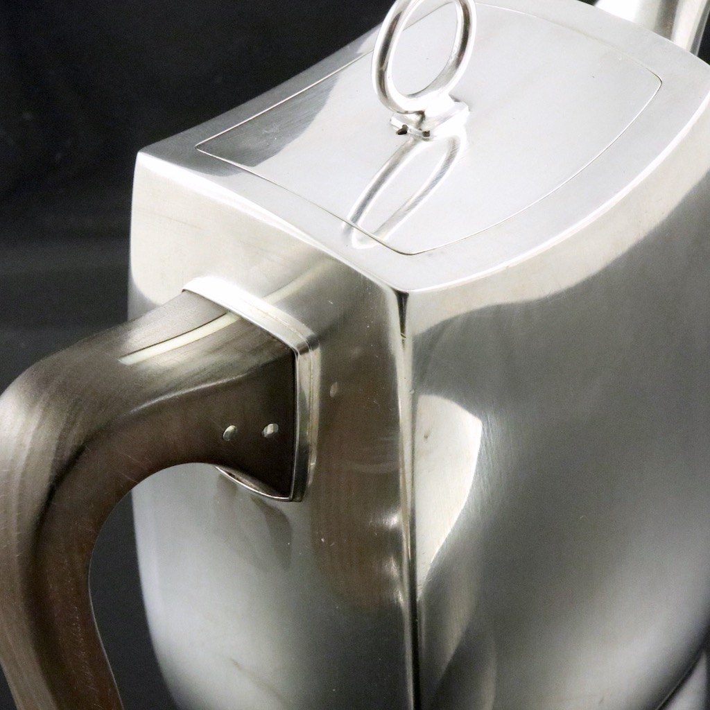 The Set contains Mocha Pot with Handle of guaiacum (South American hardwood) with inlaid Ivory. Lidded Sugar Bowl and Creamer.