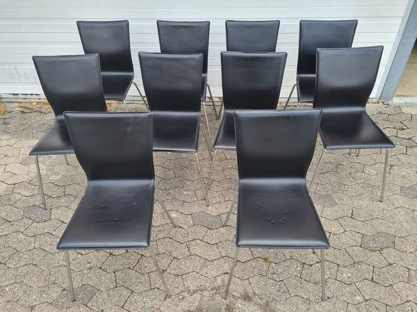 10 nyere fremstillede spisebordsstole i nappa og metal. Enkelte brugsspor på sæder fra at have været stablet.
