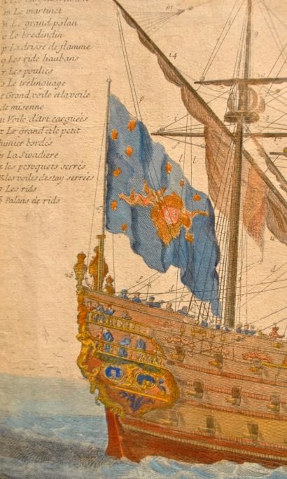 Fransk kunstner (17. årh.): Vaisseau du Premier Rang portant Pavillon d'Admiral. Håndkoloreret kobberstik. 44 x 53 cm.