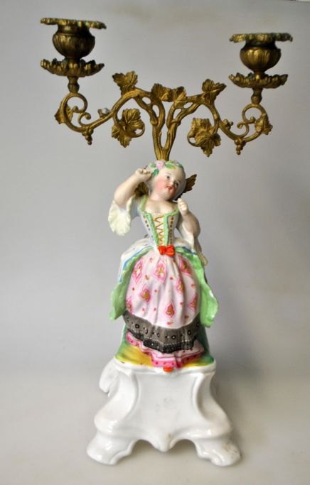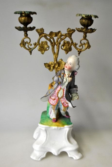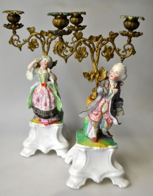 Par franske kandelabre af porcelæn og bronze, 19. årh. Håndbemalet bisquit porcelæn. Dekoreret med figurer. Rococo stil. H.: 31 cm.