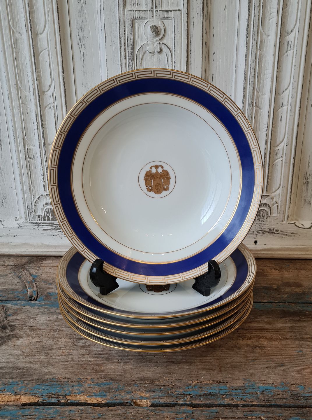 Sæt på 6 B&G dybetallerken dekoreret med kongeblå fane, græsk evighedsmønster og våbenskjold i guld.