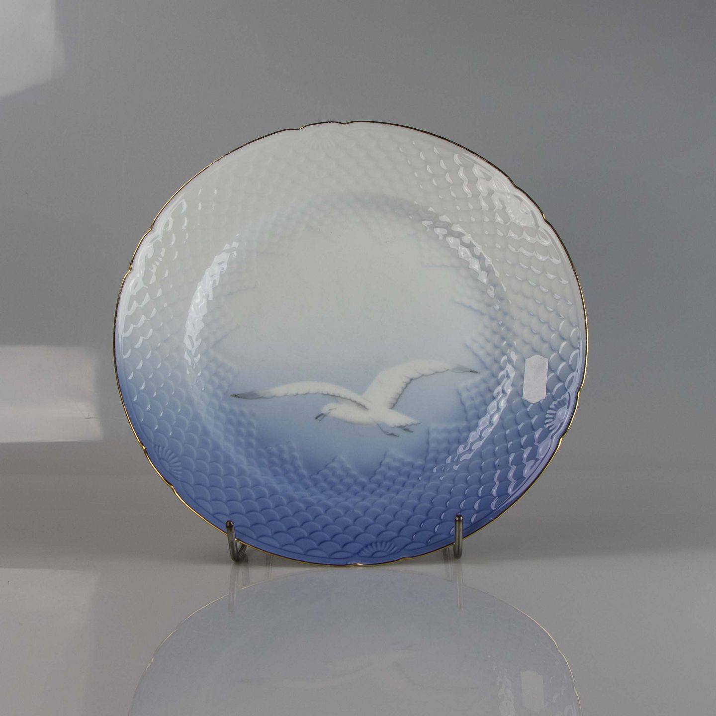 Tallerken fremstillet i porcelæn med skelform i gradueret blå nuancer med guldkant samt motiv af måge.