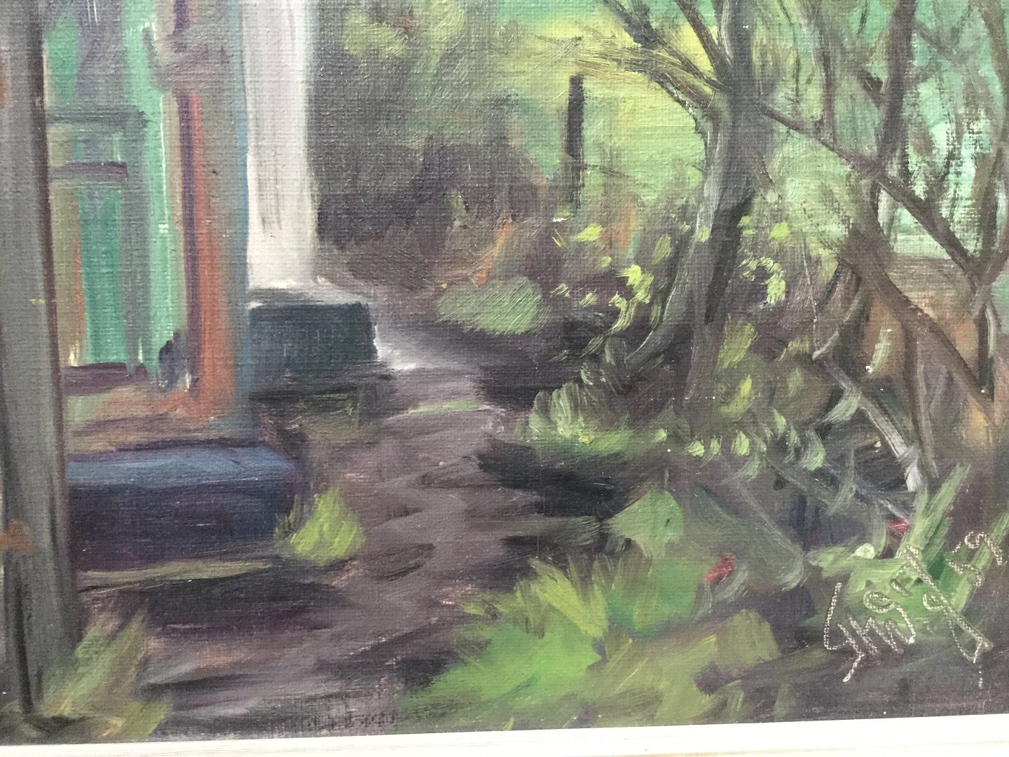 Maleri af Thorvald Jørgensen - Gårdeksteriør med das 1959