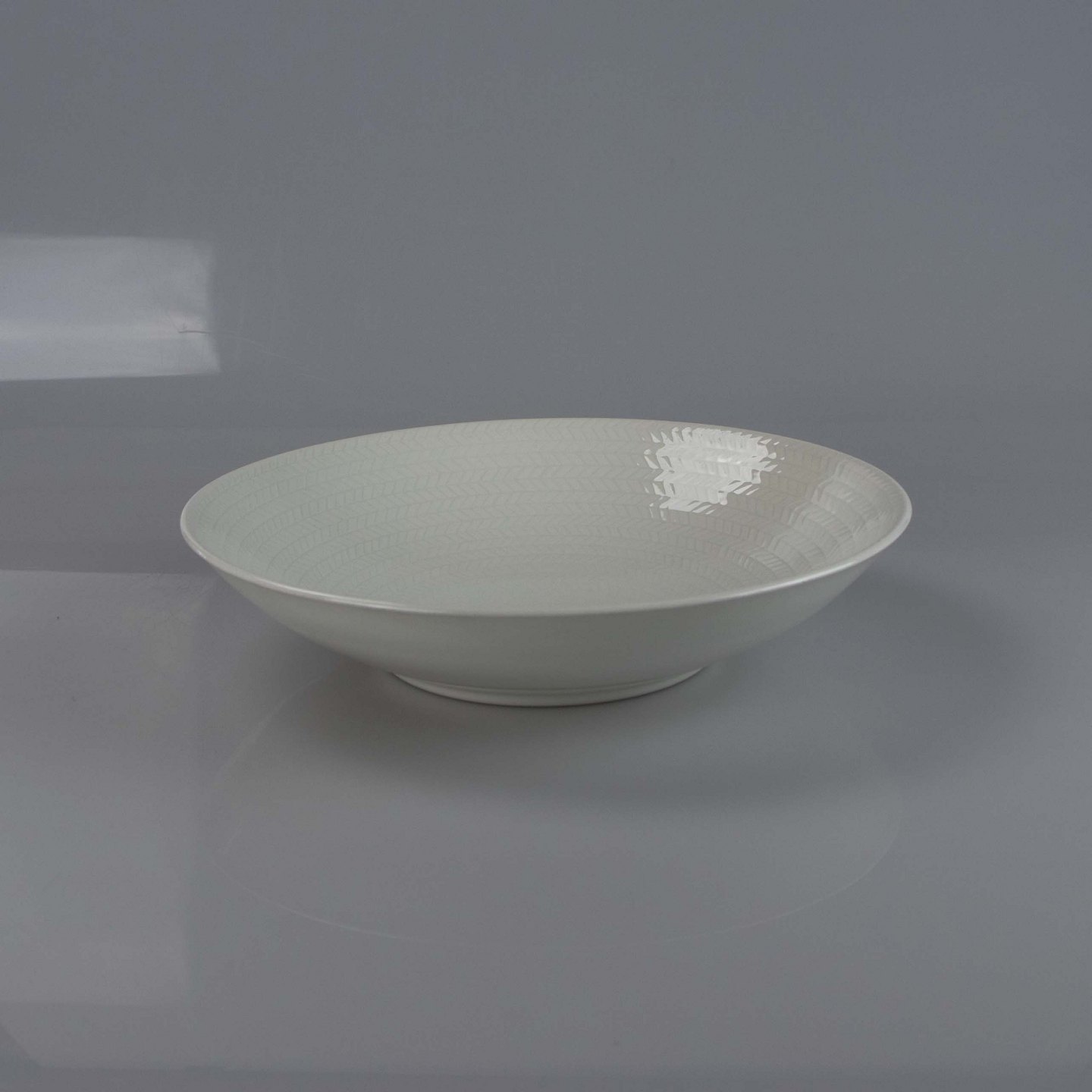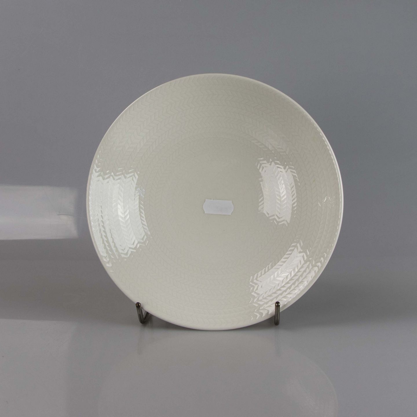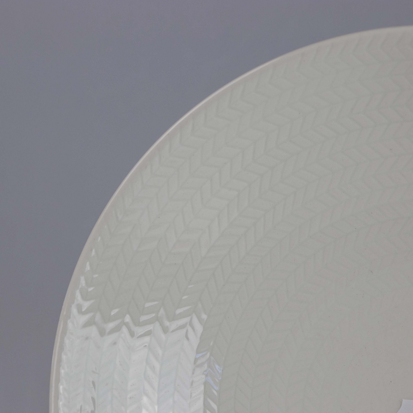 Tallerken fremstillet i i hvid fajance med indstøbt sildebensmønster.