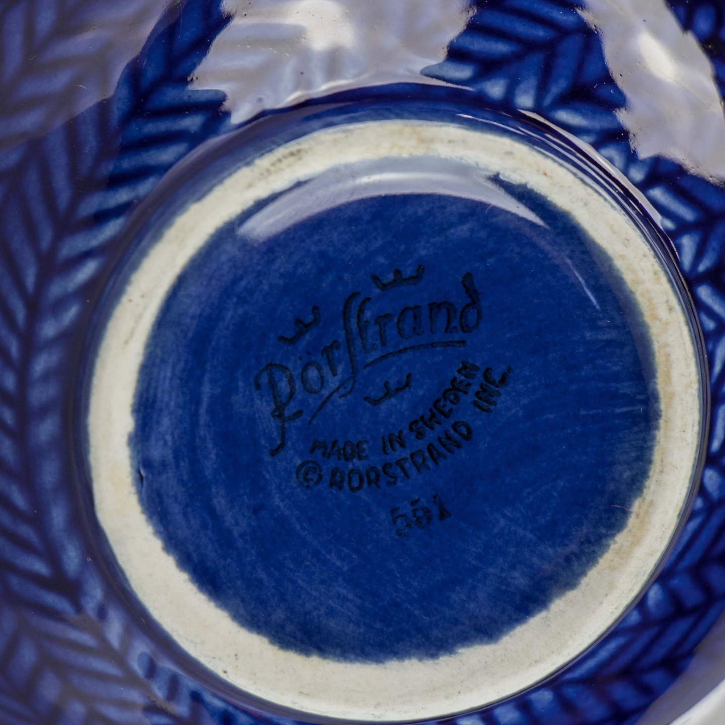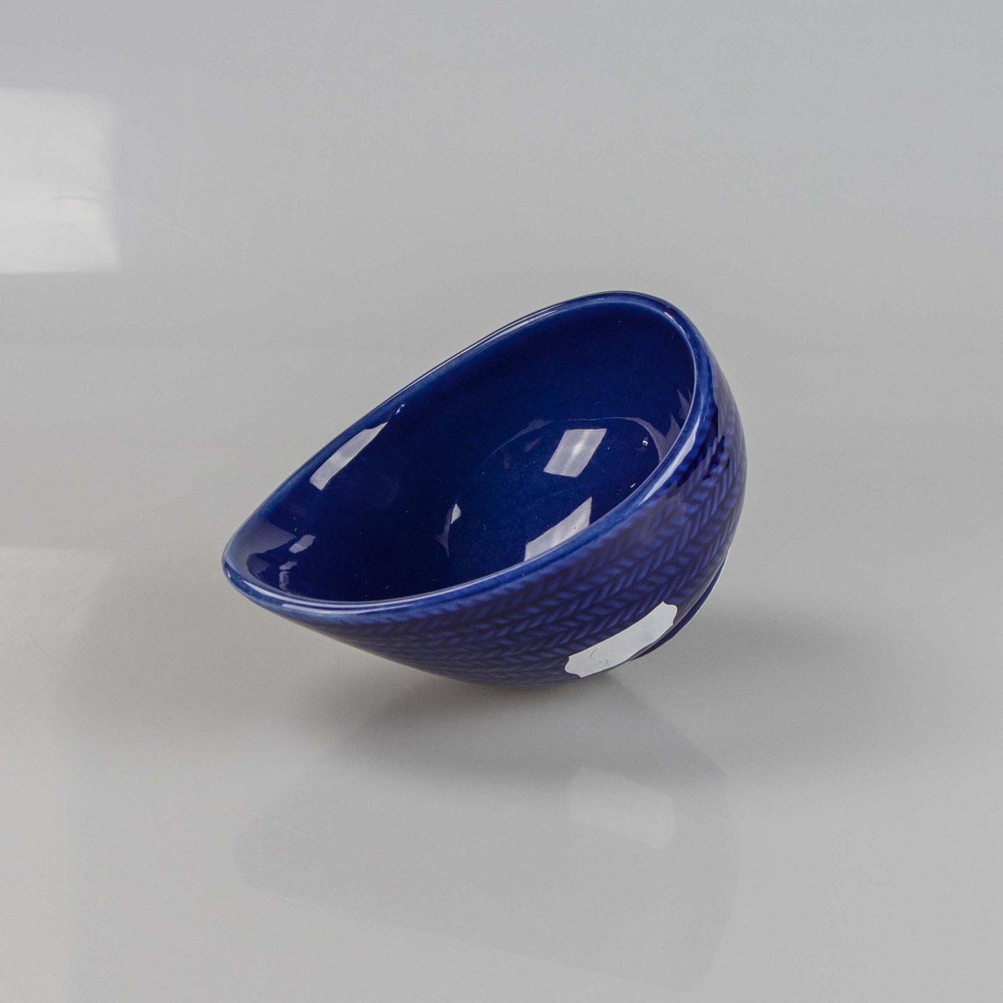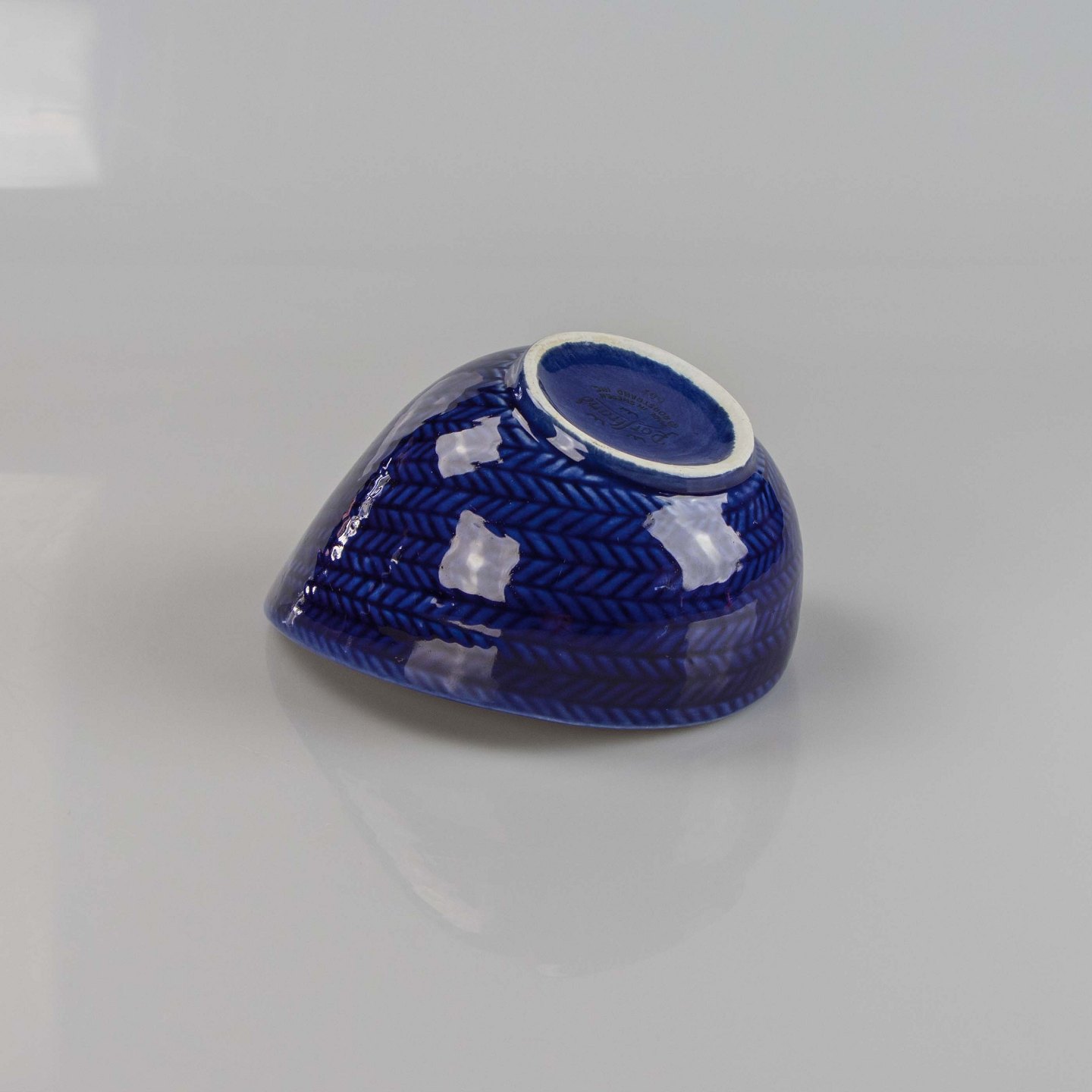 Skål fremstillet i blå fajance med indstøbt sildebensmønster.