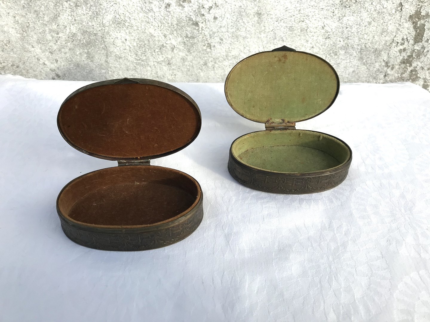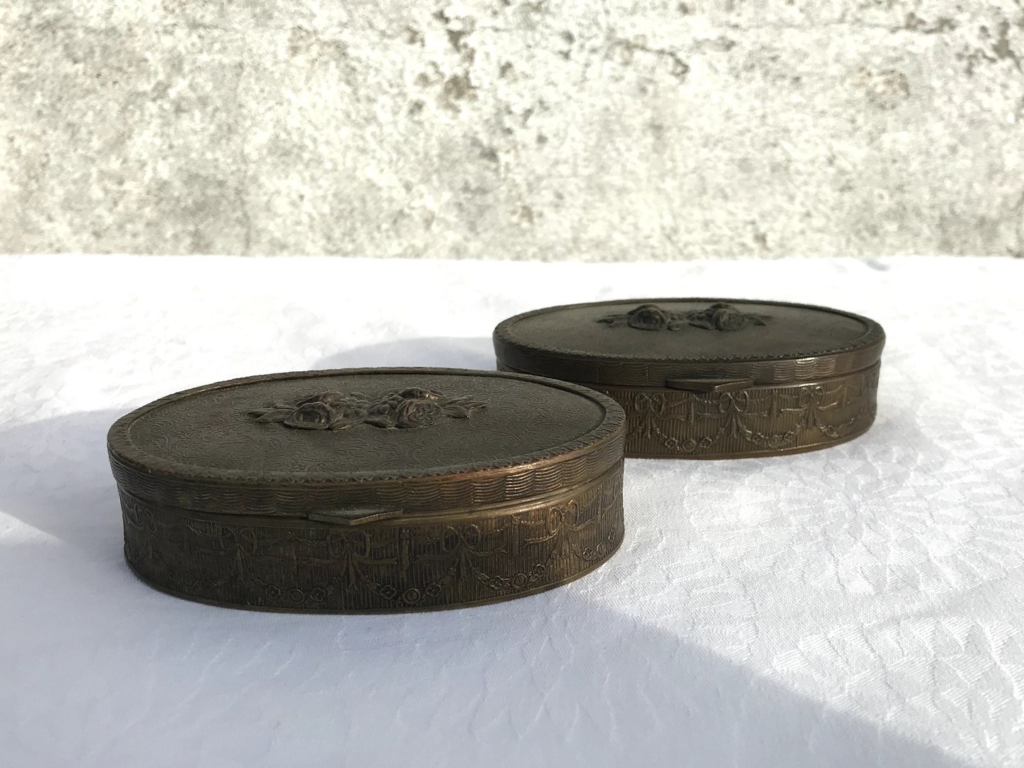 2 almost identical bronze chests / boxes with rose motifs, stamped at the bottom: Bronze. 12cm long, 8cm wide, 3cm high, * Nice patinated condition *