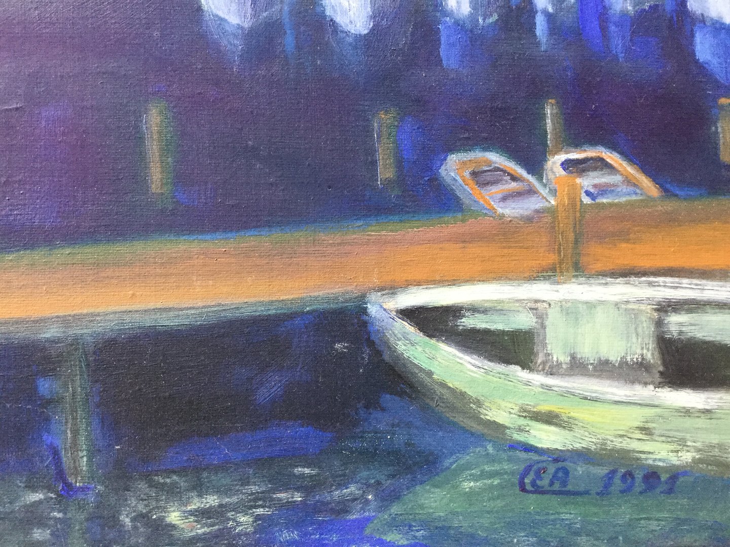 Text available in Danish: Maleri af Ernst A. Christiansen 1991 - Parti fra Aså Havn.
