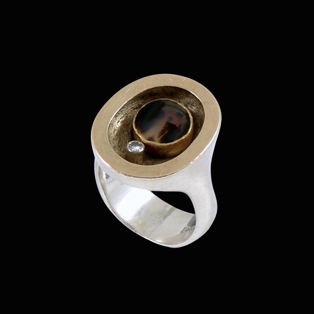 Ole Waldemar Jacobsen. Ring i Sterling sølv med guld mosagat og diamant.