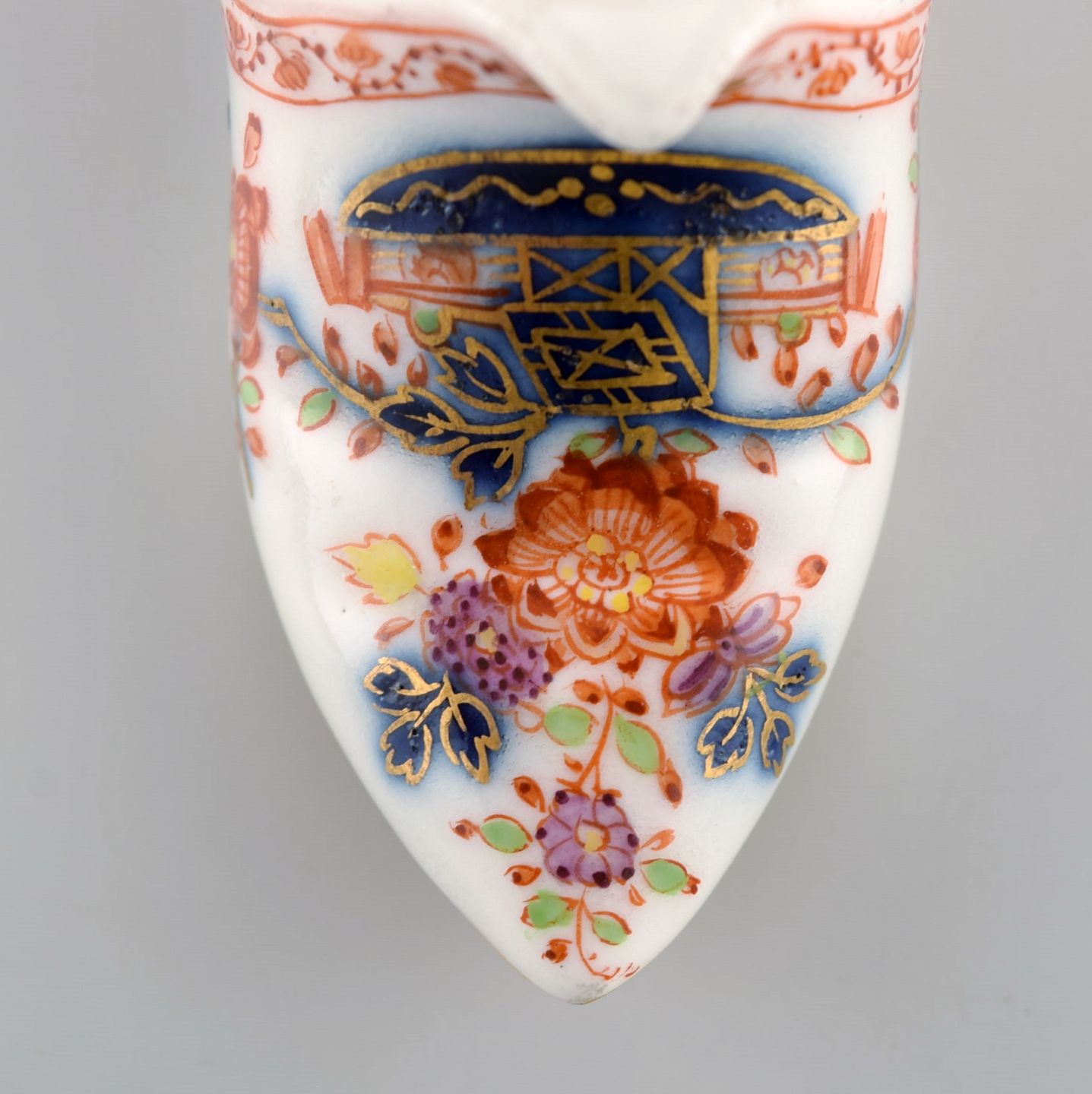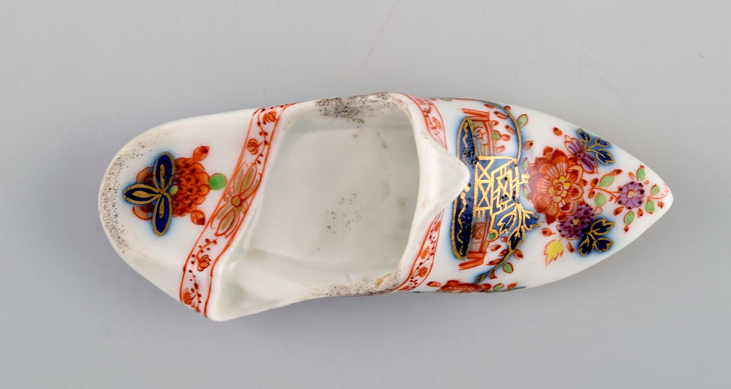 Antik Meissen slipper i håndmalet porcelæn med blomstermotiver og guldkant. Tidligt 1800-tallet.