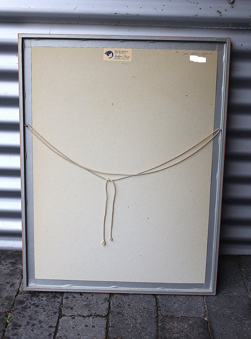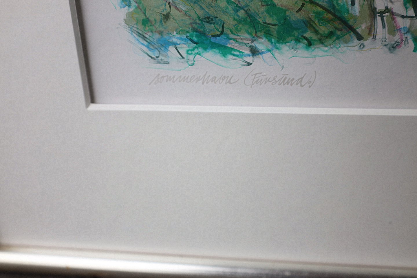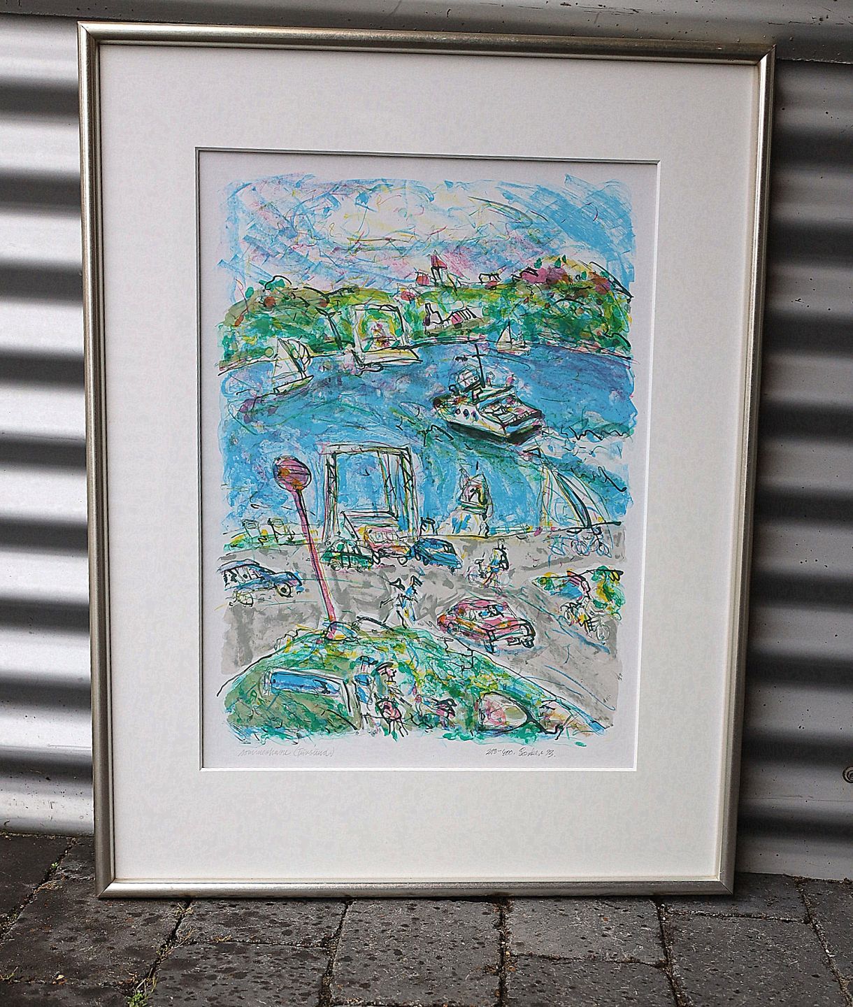 Kunstner Jørn Særker Sørensen. Litografi. nr 218/400. Litografiet forestiller en sommerhavn ved Furstrand. Litografiet er indrammet i passepartout.