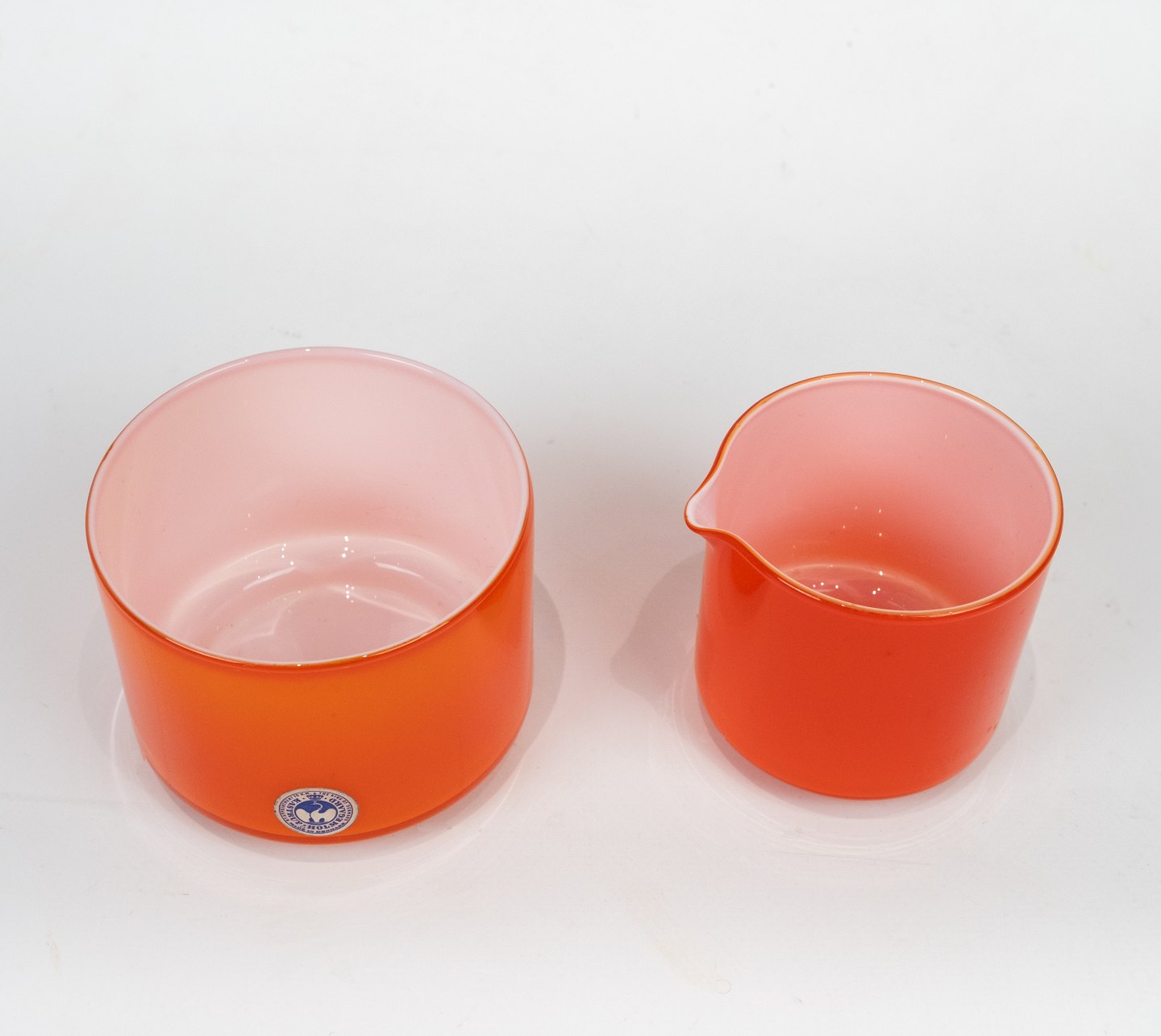 Orange glass sugar bowl and red glass cream jug with white opaline glass on the inside from the Palet series by Michael Bang for Holmegaard.