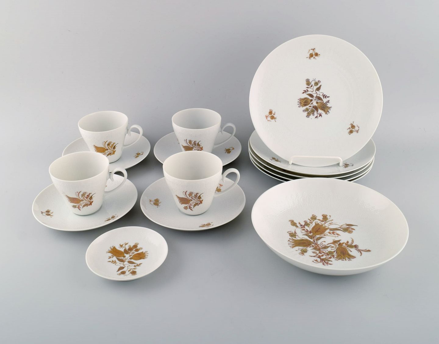 Bestående af fire kaffekopper med underkopper, fem tallerkener og to skåle.