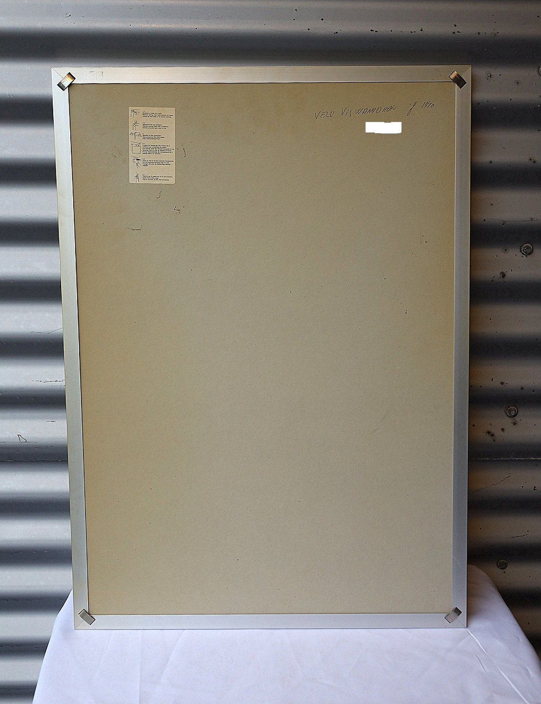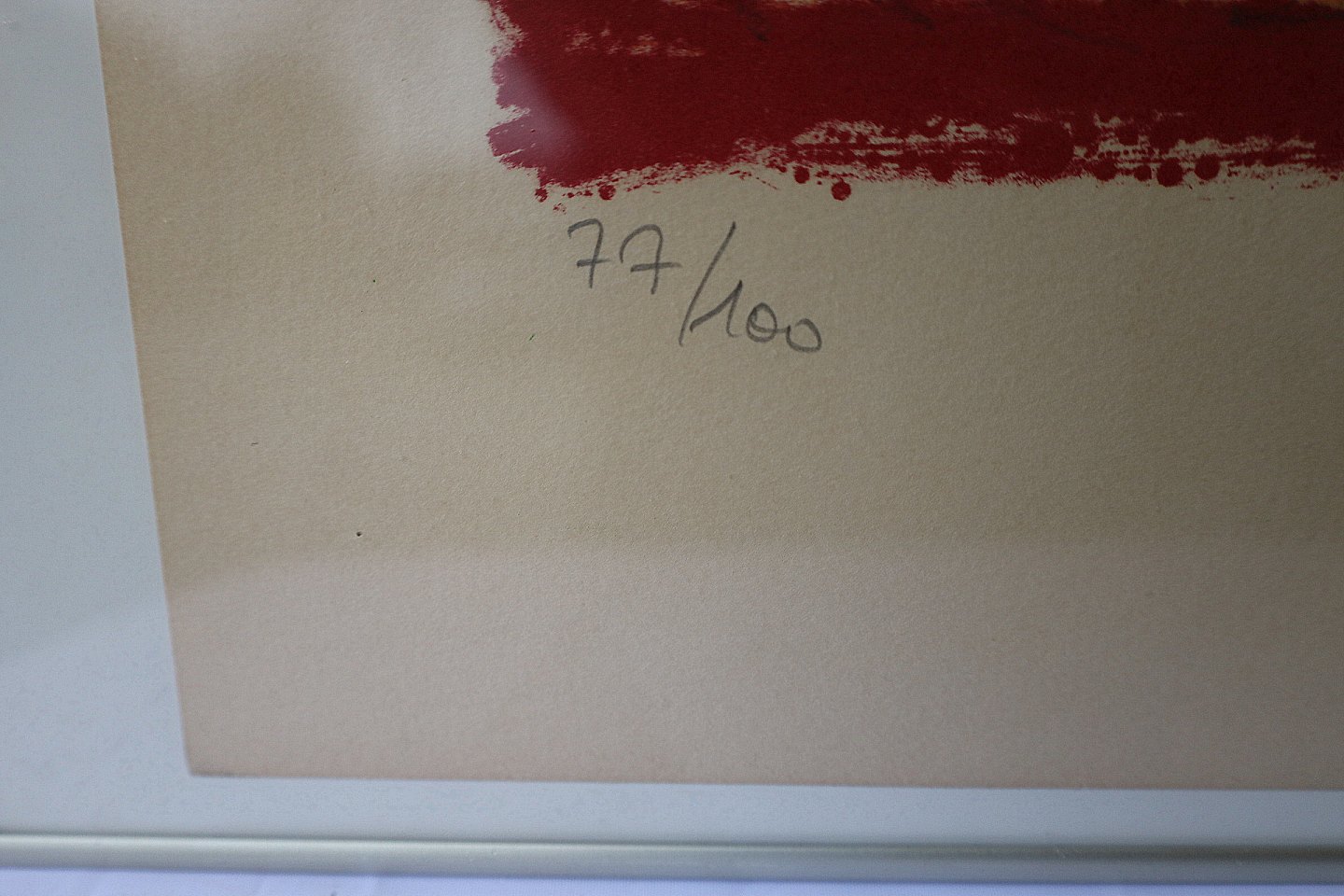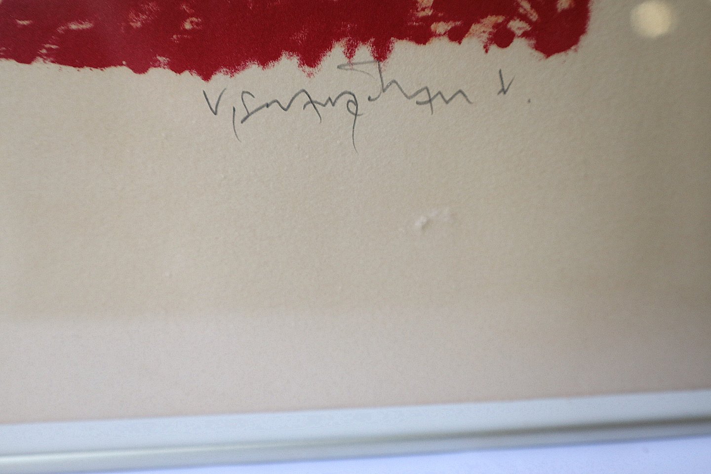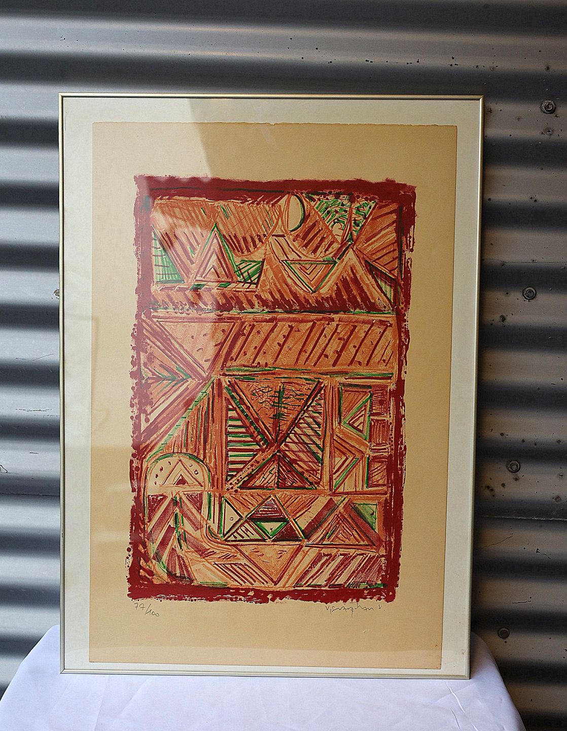 Velu Viswanadhan, Inder, født 1940. Litografi, nr. 77/100, i geometriske mønstre, i røde og grønne farver.