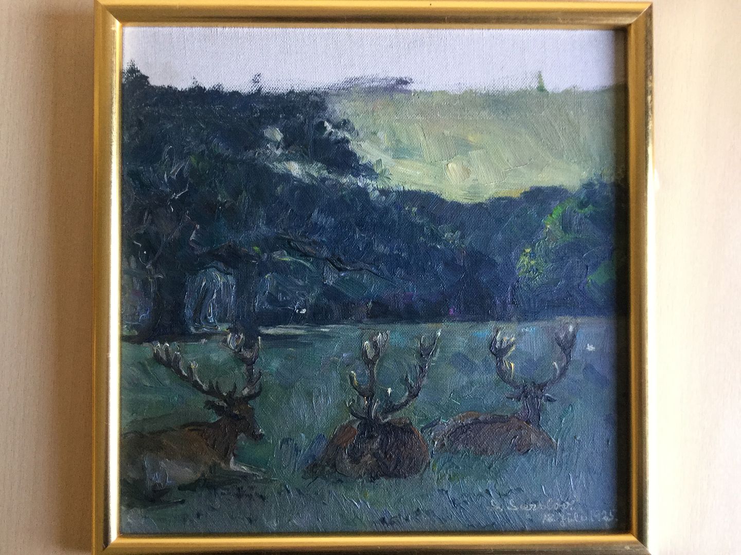 Maleri af Frederik Larsen-Særsløv 1925 - Hvilende Kronhjorte ved skov.