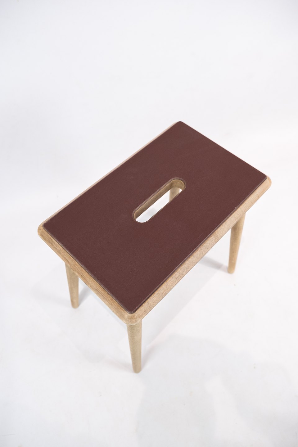 This stool with a brown laminate top and oak legs is a stylish and functional accessory for any home. Produced by Via Copenhagen, a Danish company known for their focus on quality and craftsmanship, this stool offers a perfect balance between aesthetics and functionality.