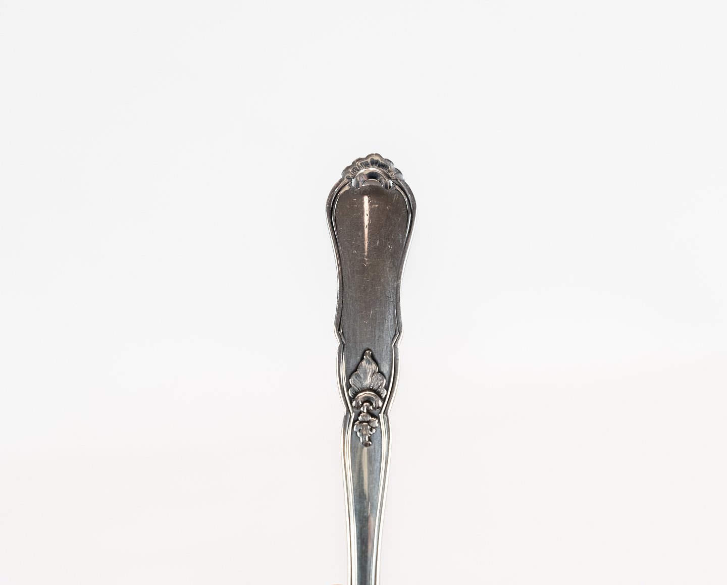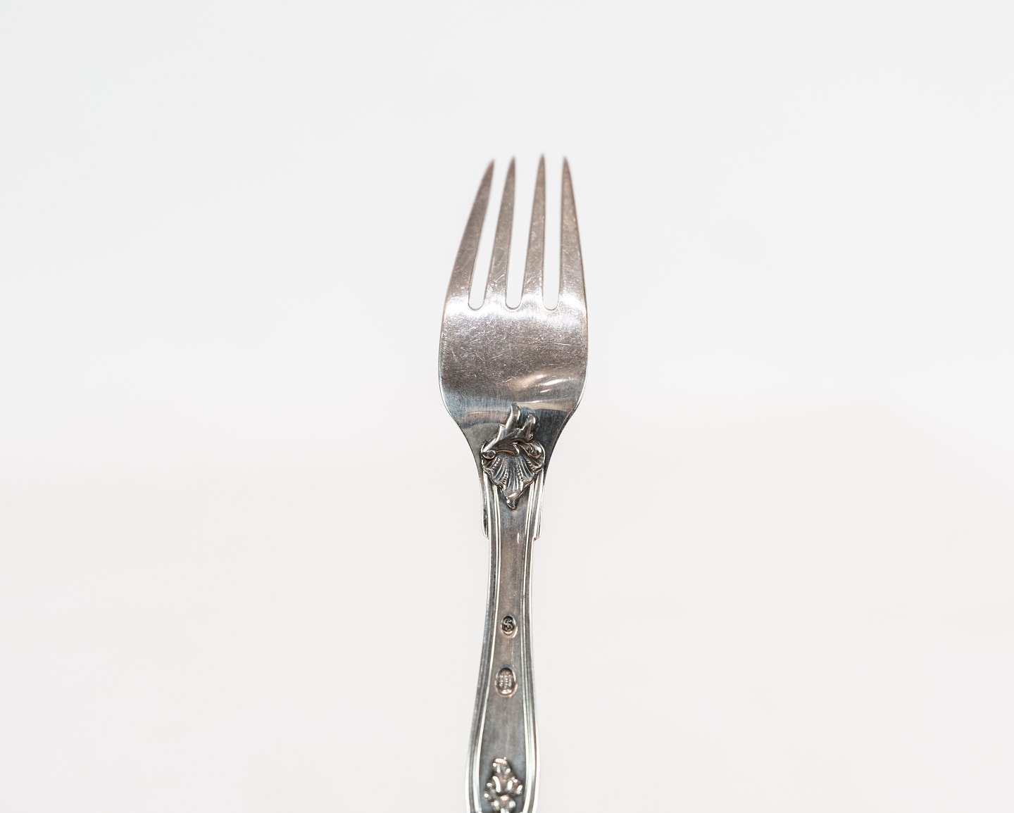 Barnegaffel i andet mønster og af tretårnet sølv.
