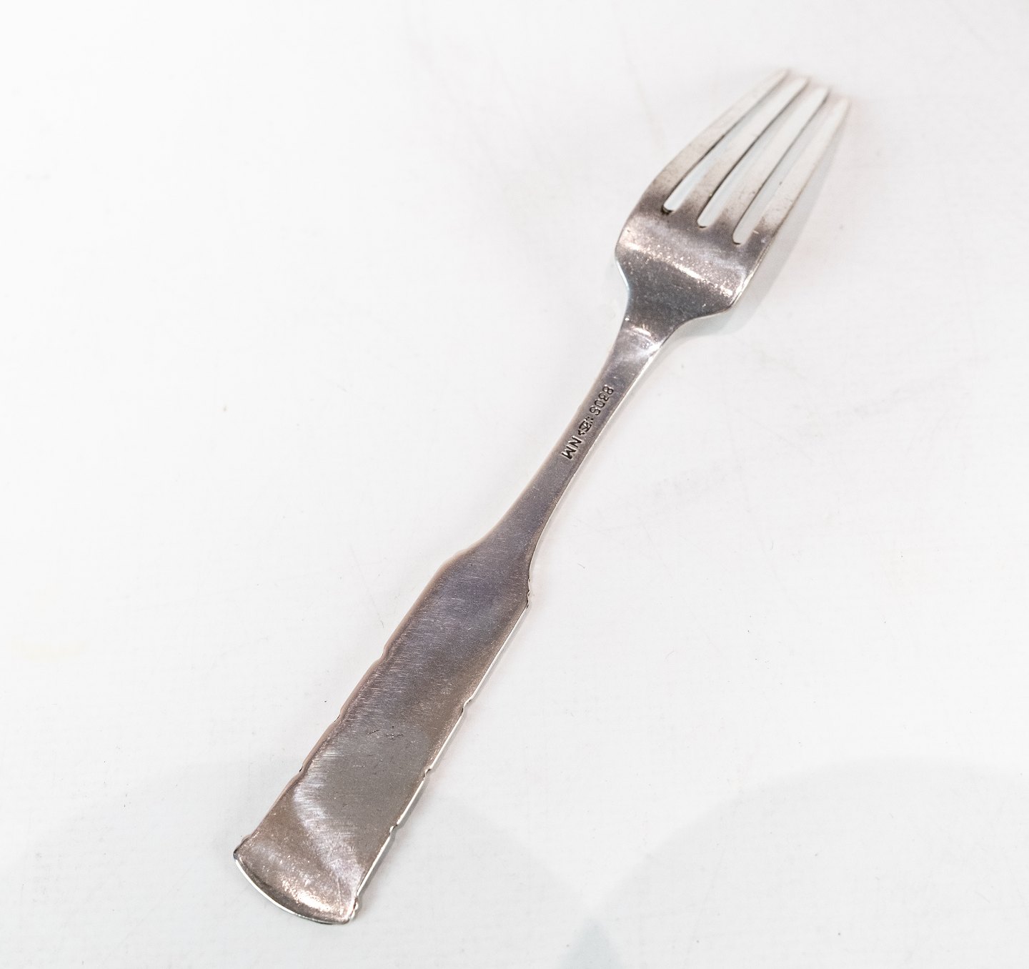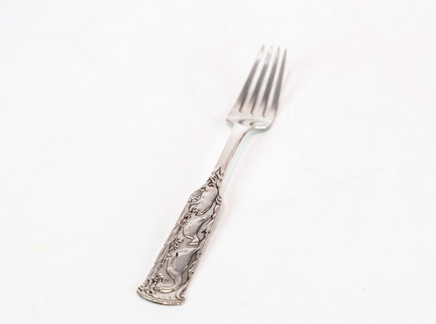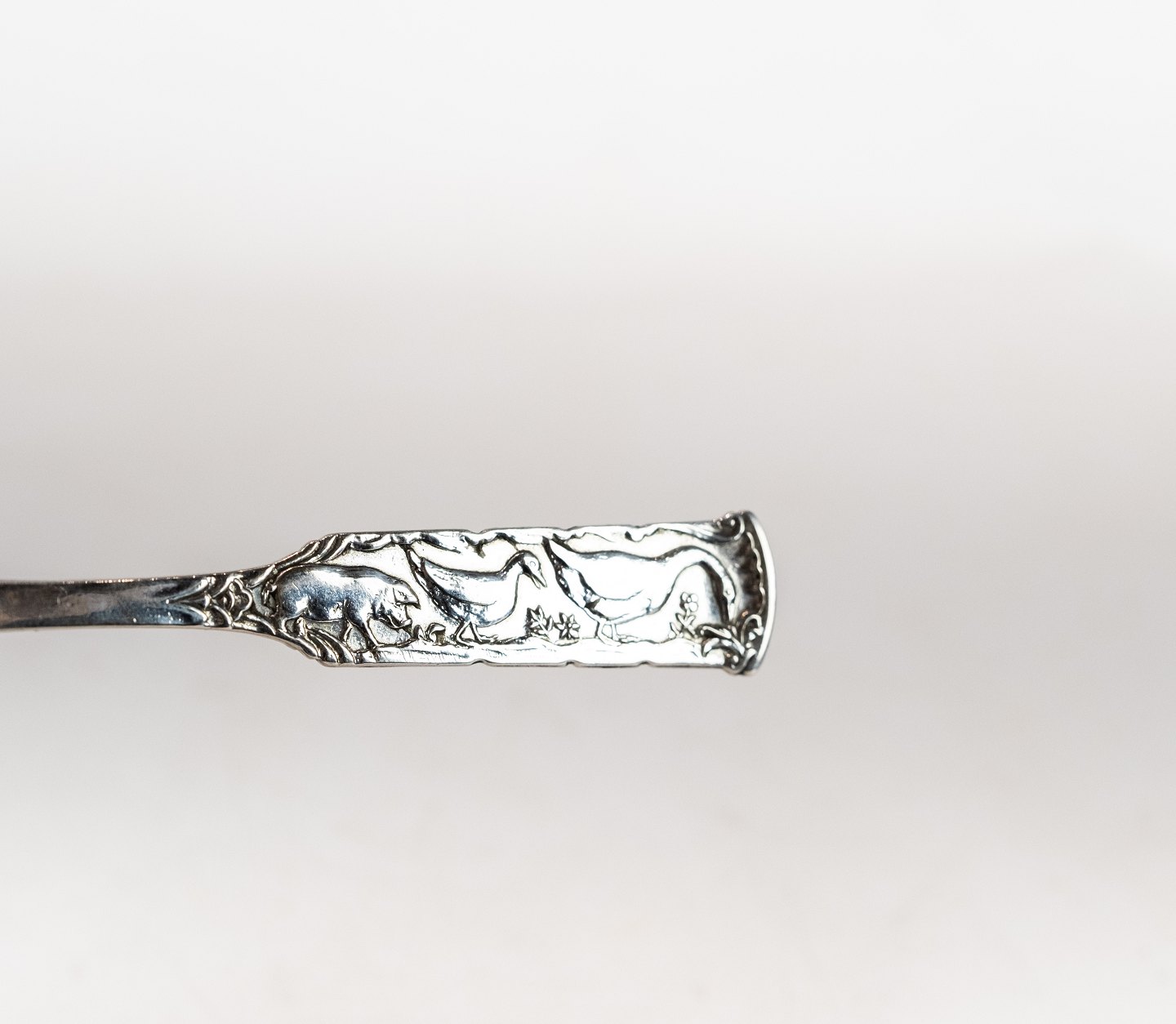 Barnegaffel med motiv af gris og ænder i tretårnet sølv.