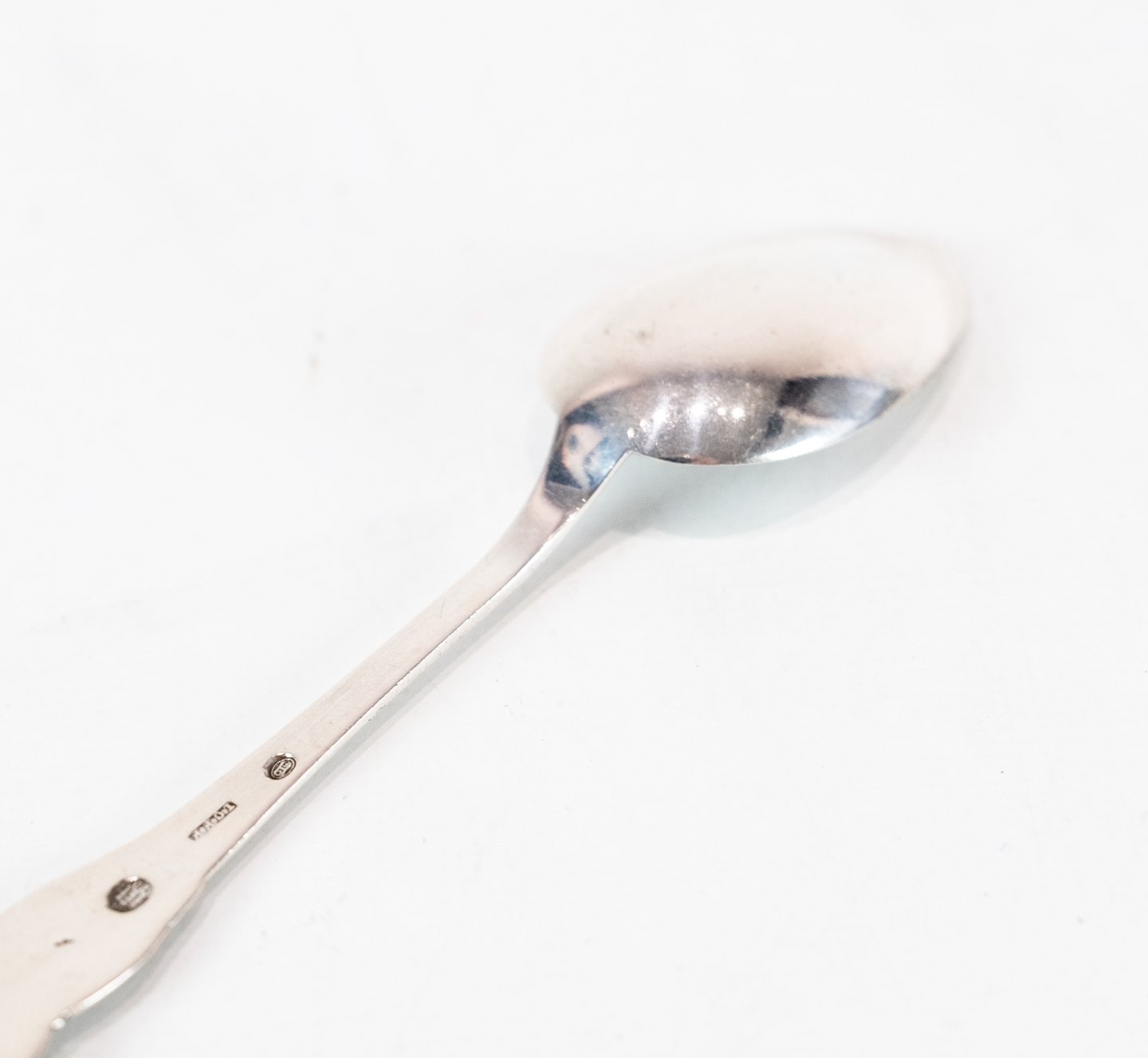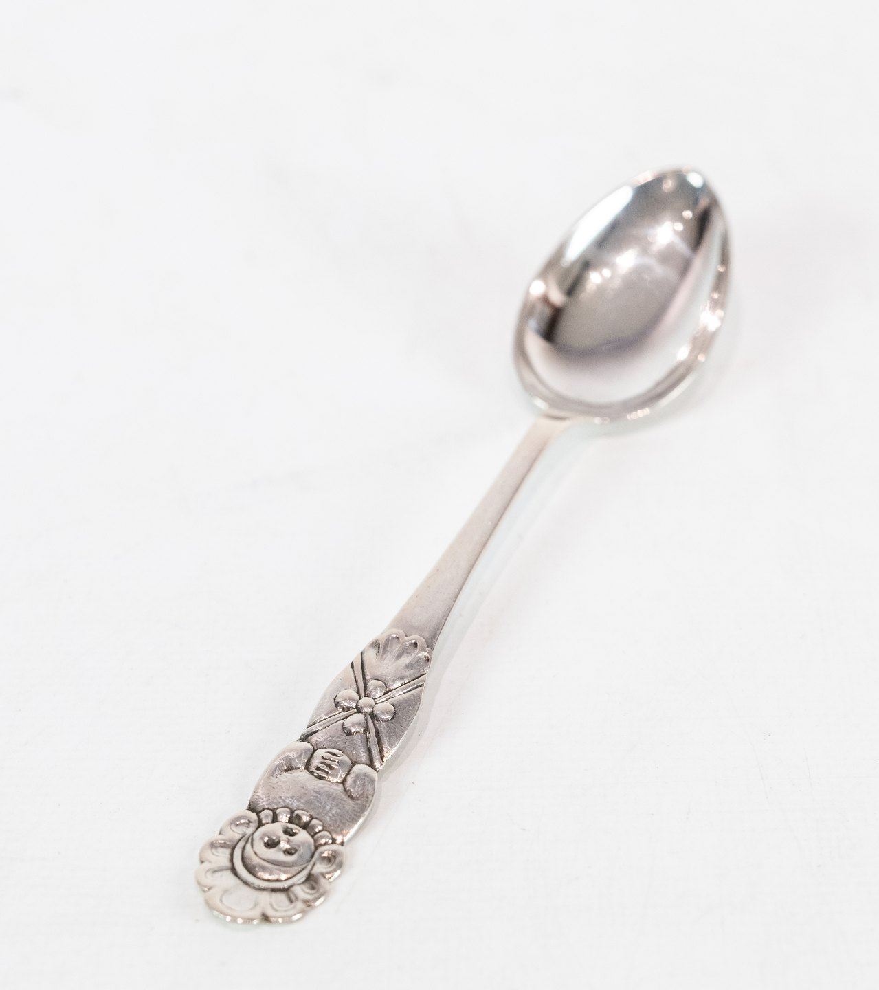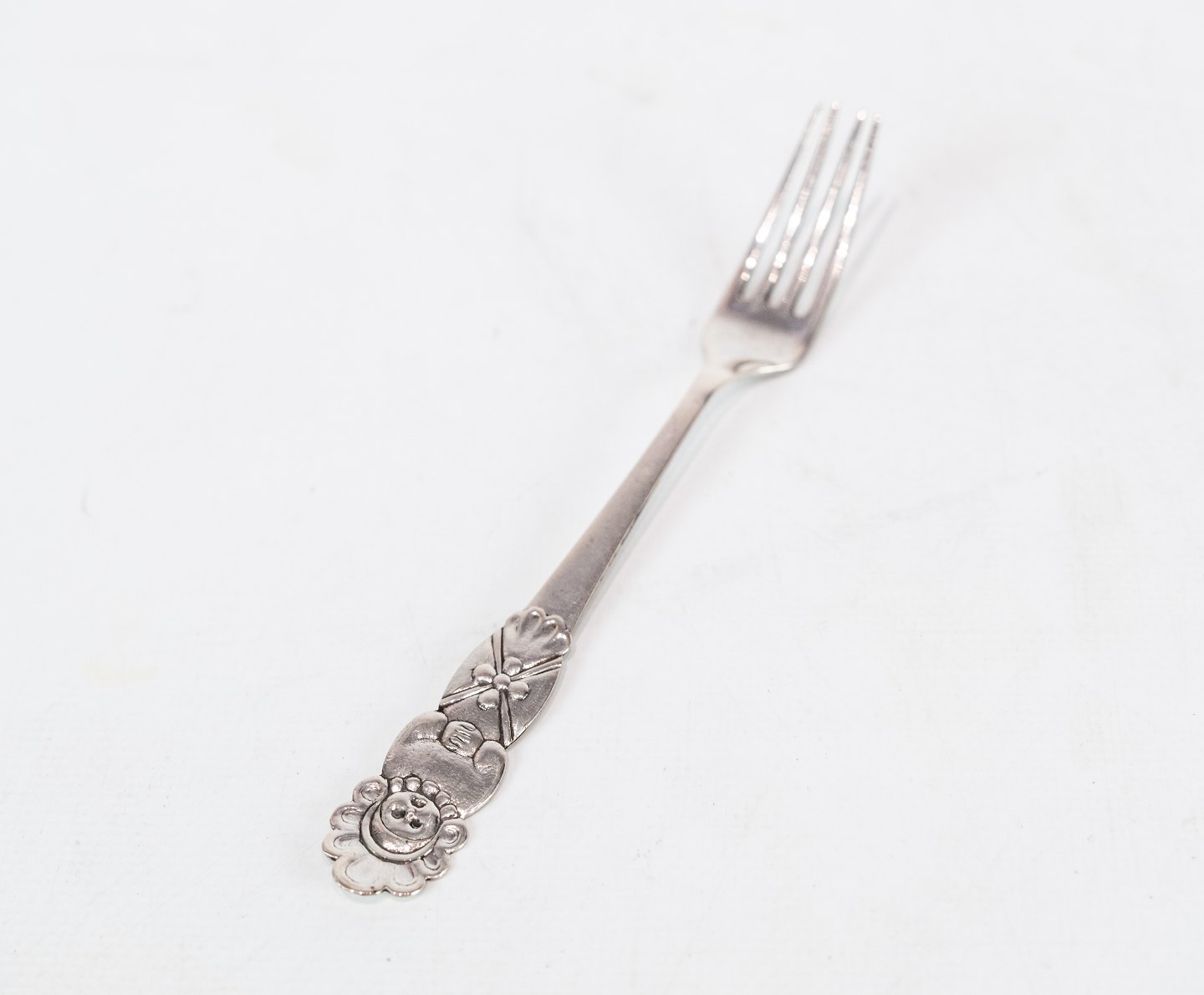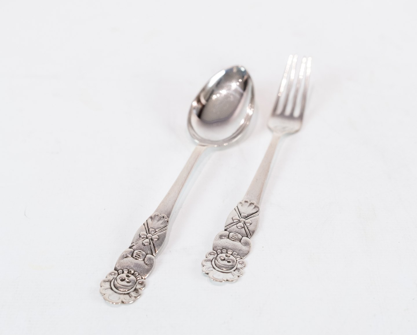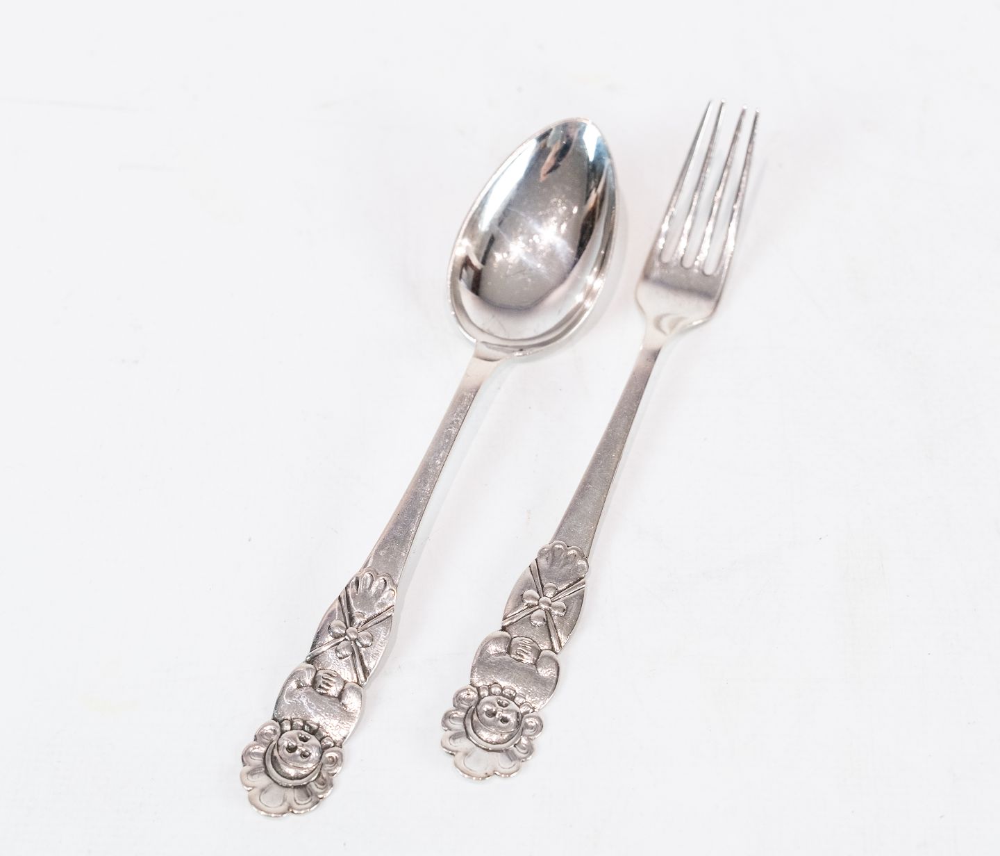 Sæt af barneske og gaffel med motiv af et barn i tretårnet sølv.