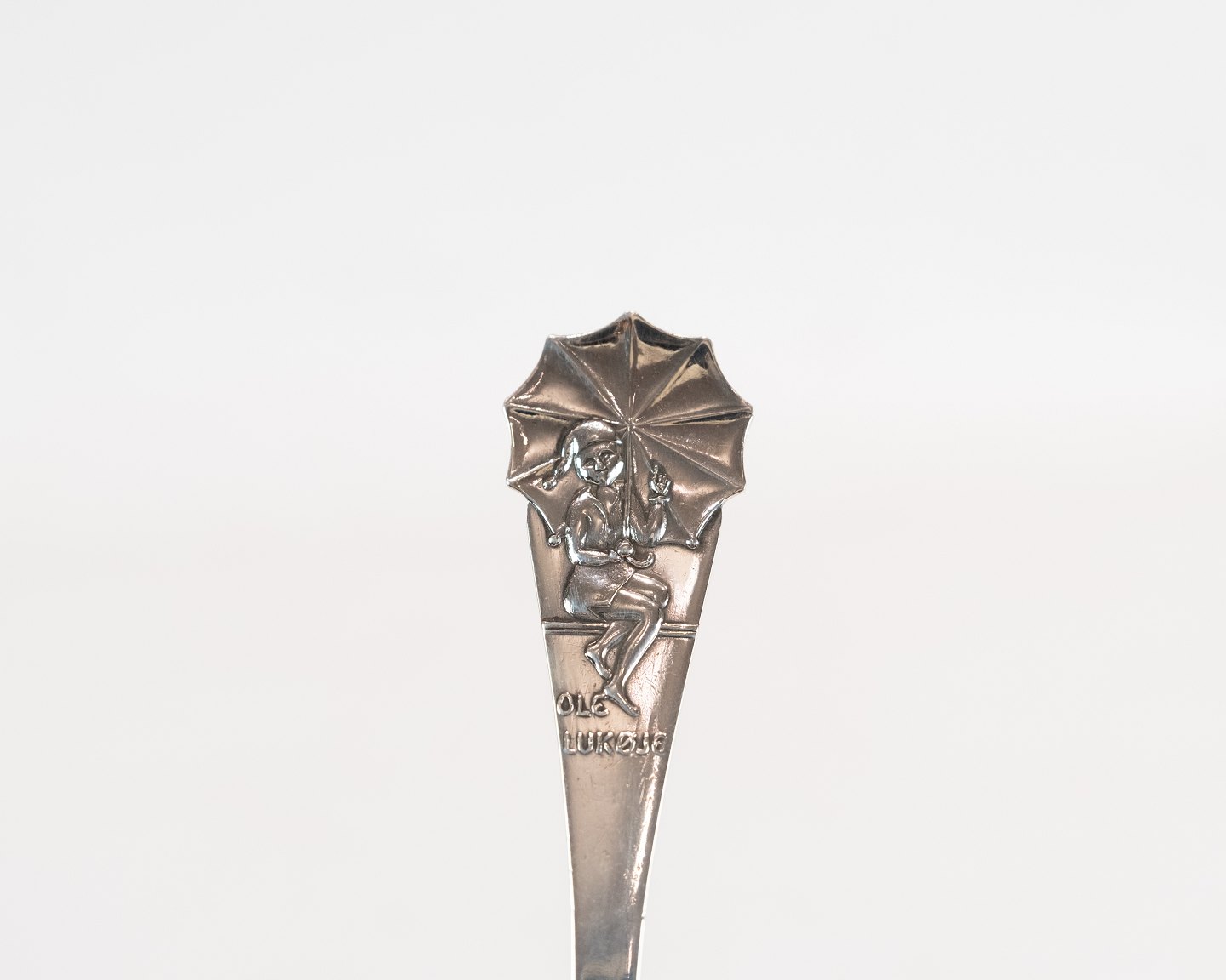 Barnegaffel med motif af H.C. Andersen Ole Lukøje i tretårnet sølv.
