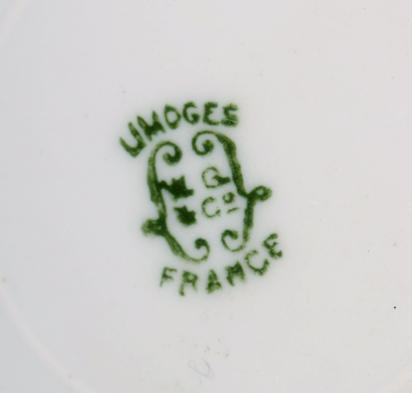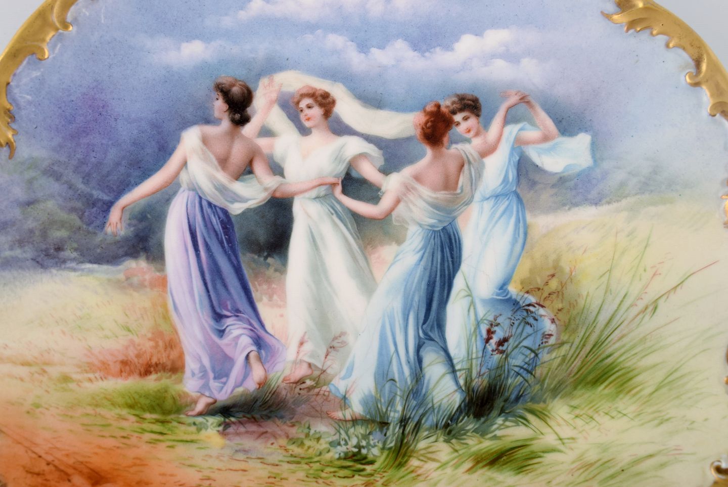 Limoges, Frankrig. Stort antikt fad i håndmalet porcelæn dekoreret med dansende kvinder og guldkant. Tidligt 1900-tallet.