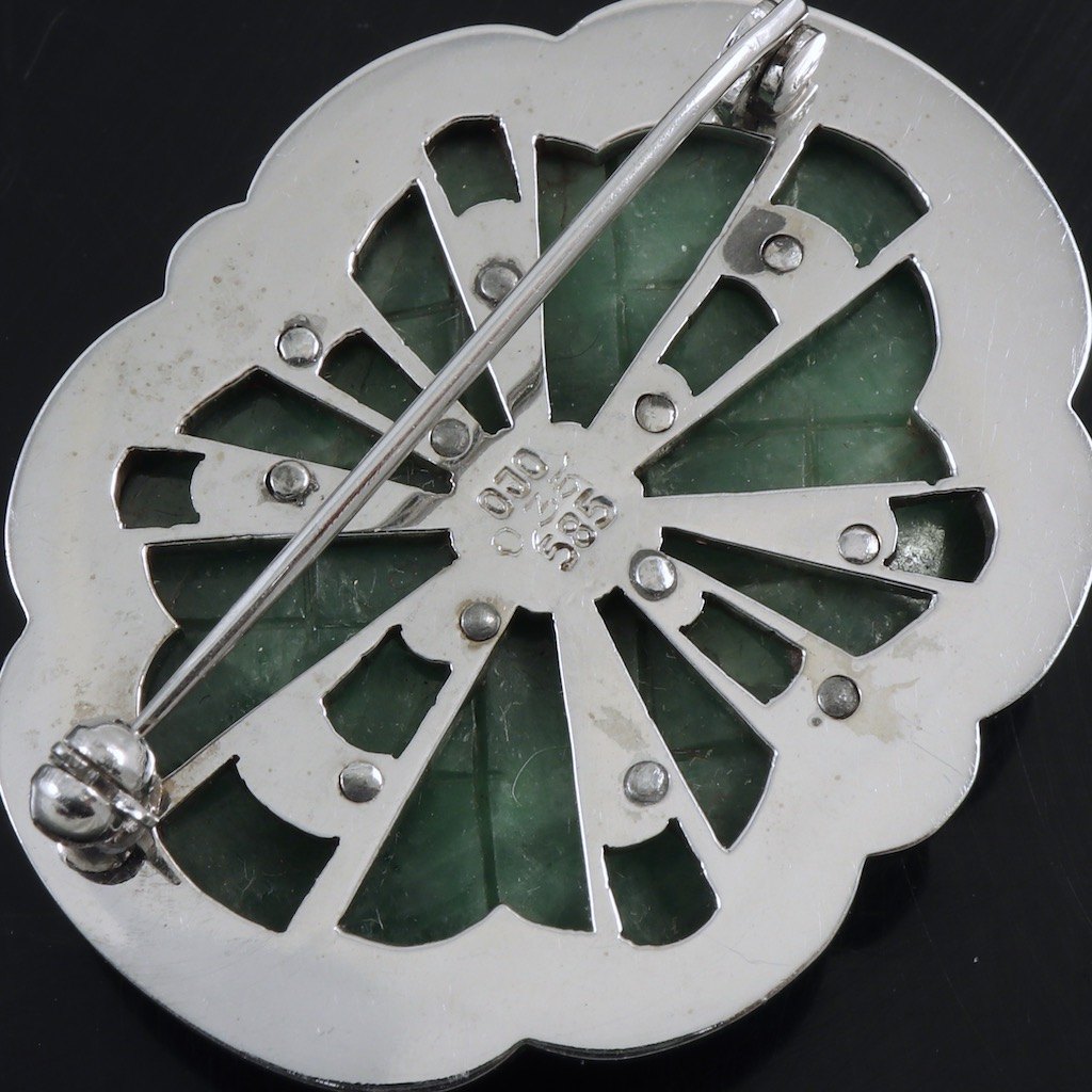 Broche i 14k hvidguld med jade og 12 diamanter. Total 0,24 ct.