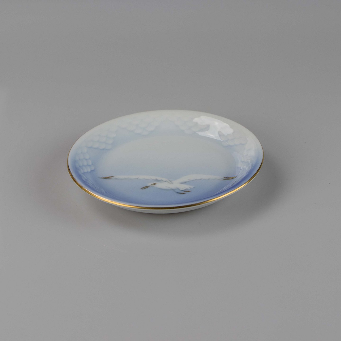 Asiet fremstillet i porcelæn med skelform i gradueret blå nuancer med guldkant samt motiv af måge.