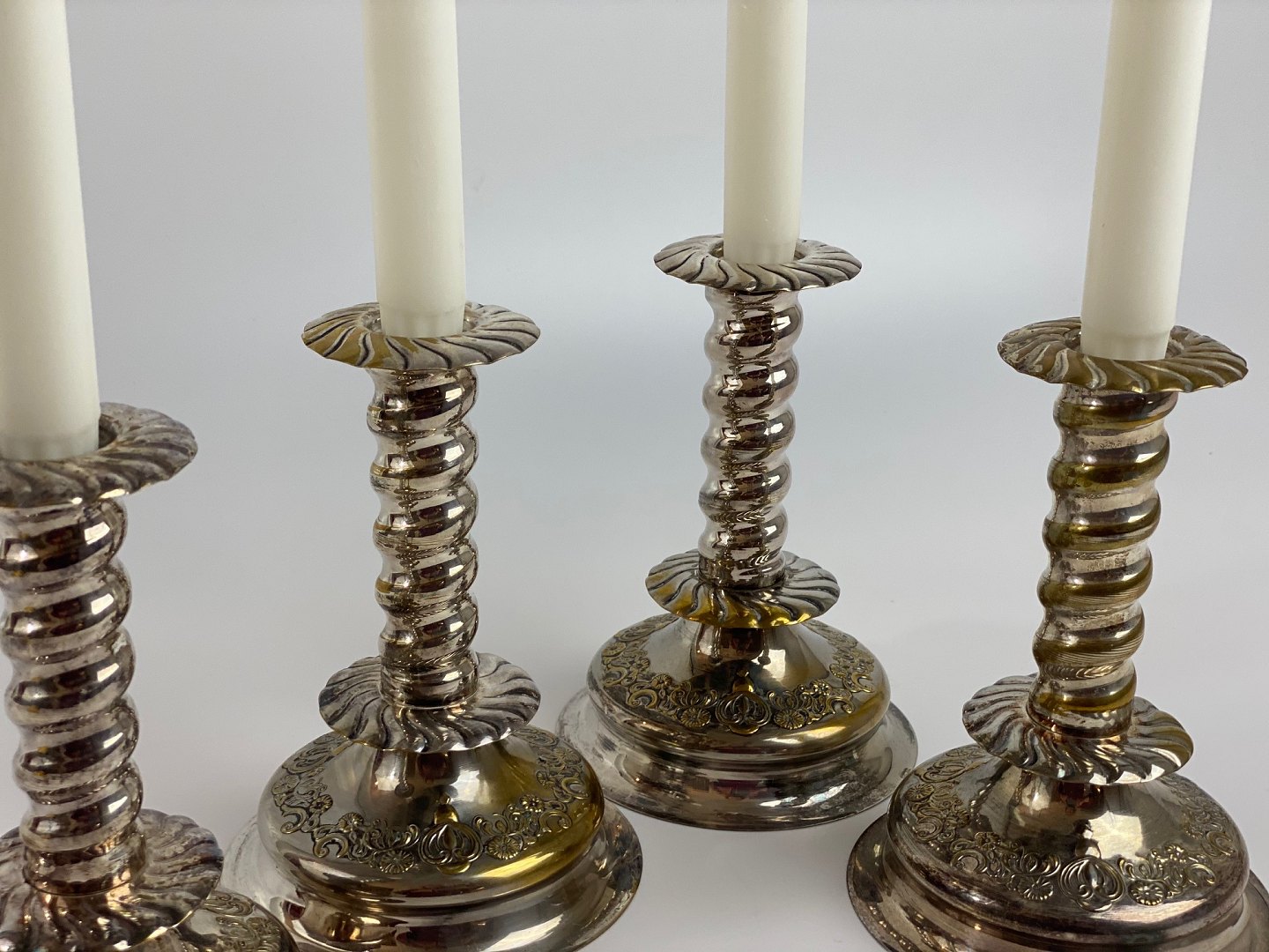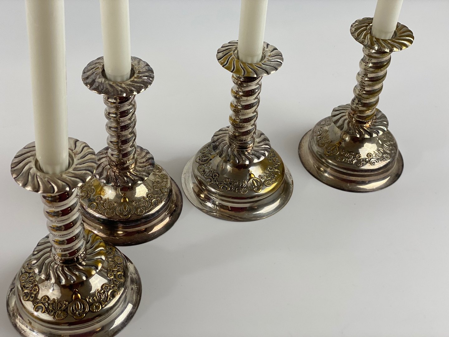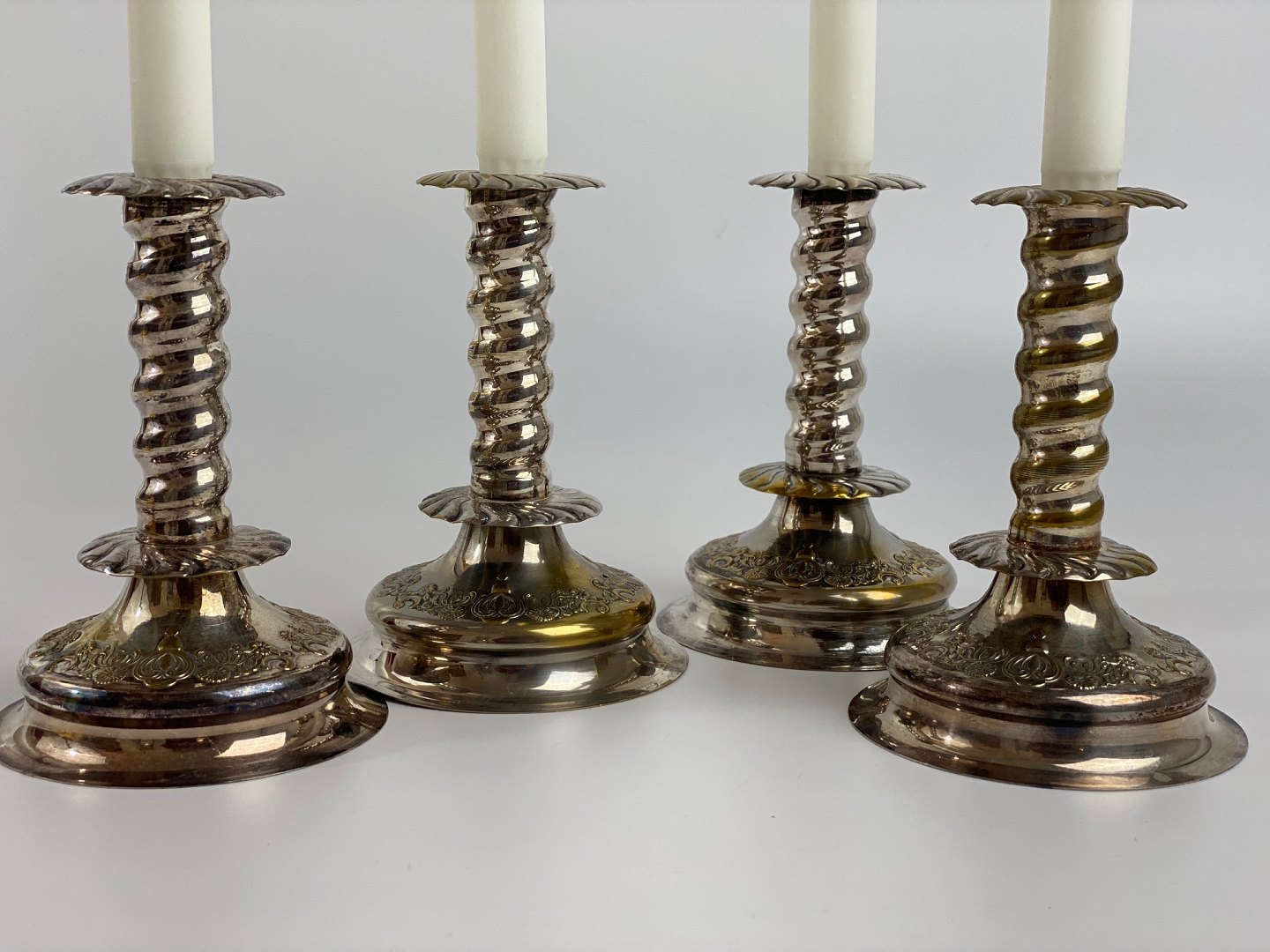 4 pcs. decorative, twisted candlesticks in silver-plated brass with patina, so that the brass can be seen in several places. Baroque form from the first half of the 20th century. The price is per piece.