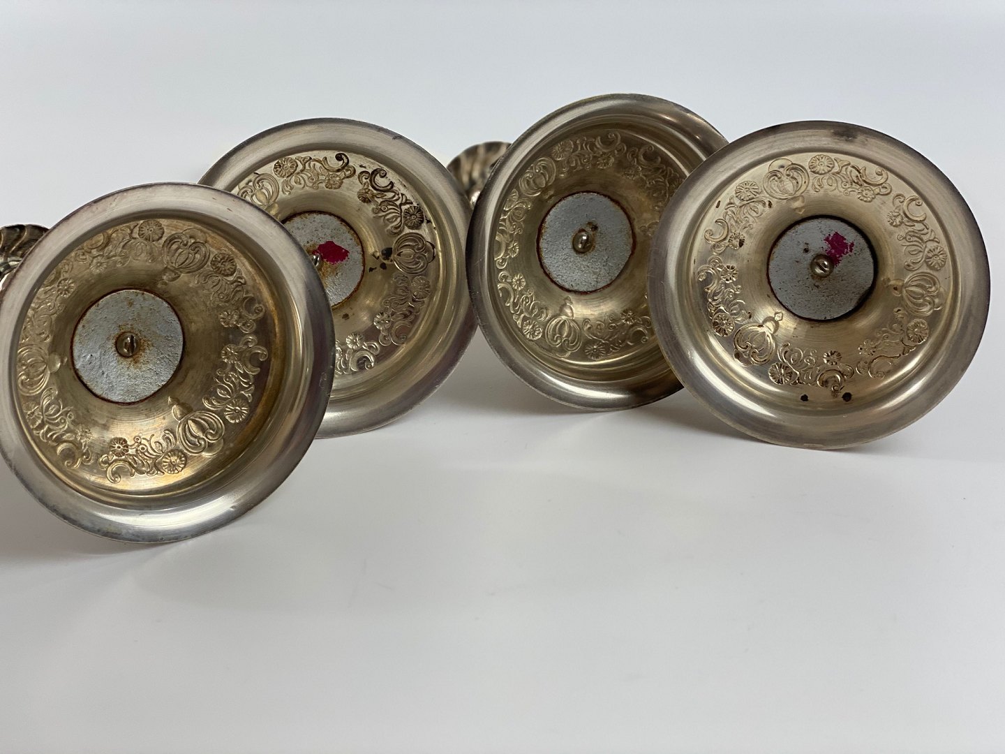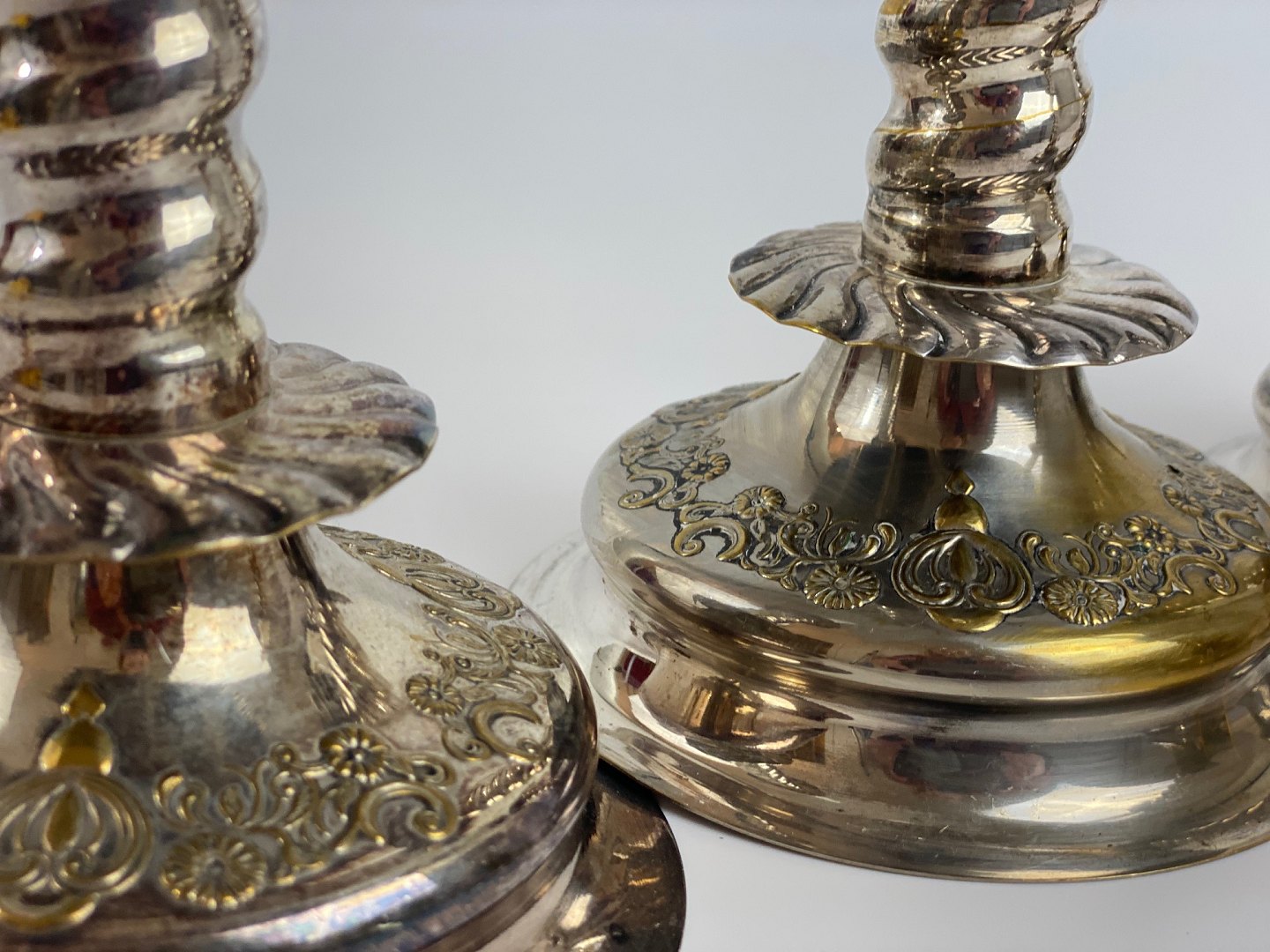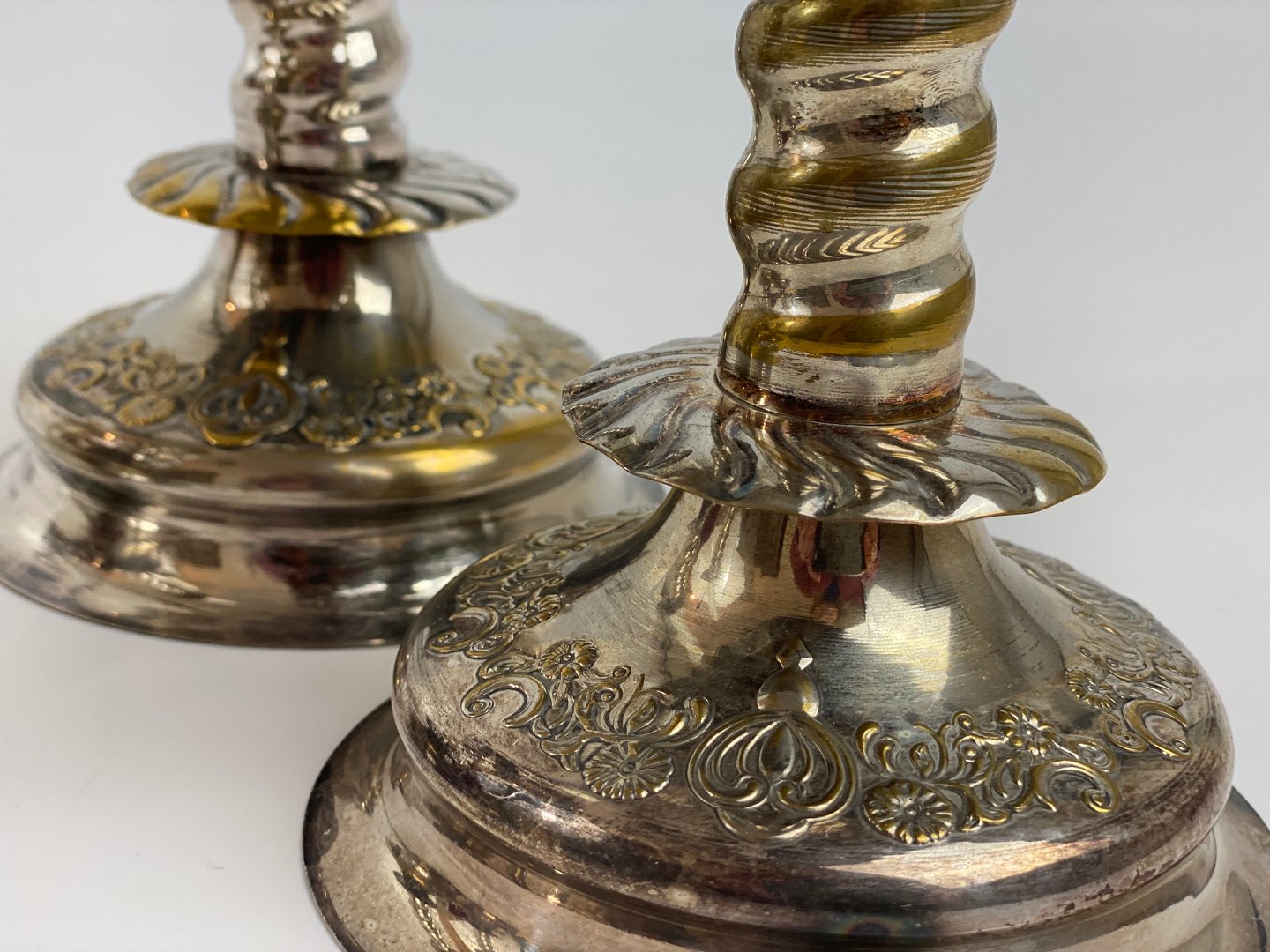 4 pcs. decorative, twisted candlesticks in silver-plated brass with patina, so that the brass can be seen in several places. Baroque form from the first half of the 20th century. The price is per piece.
