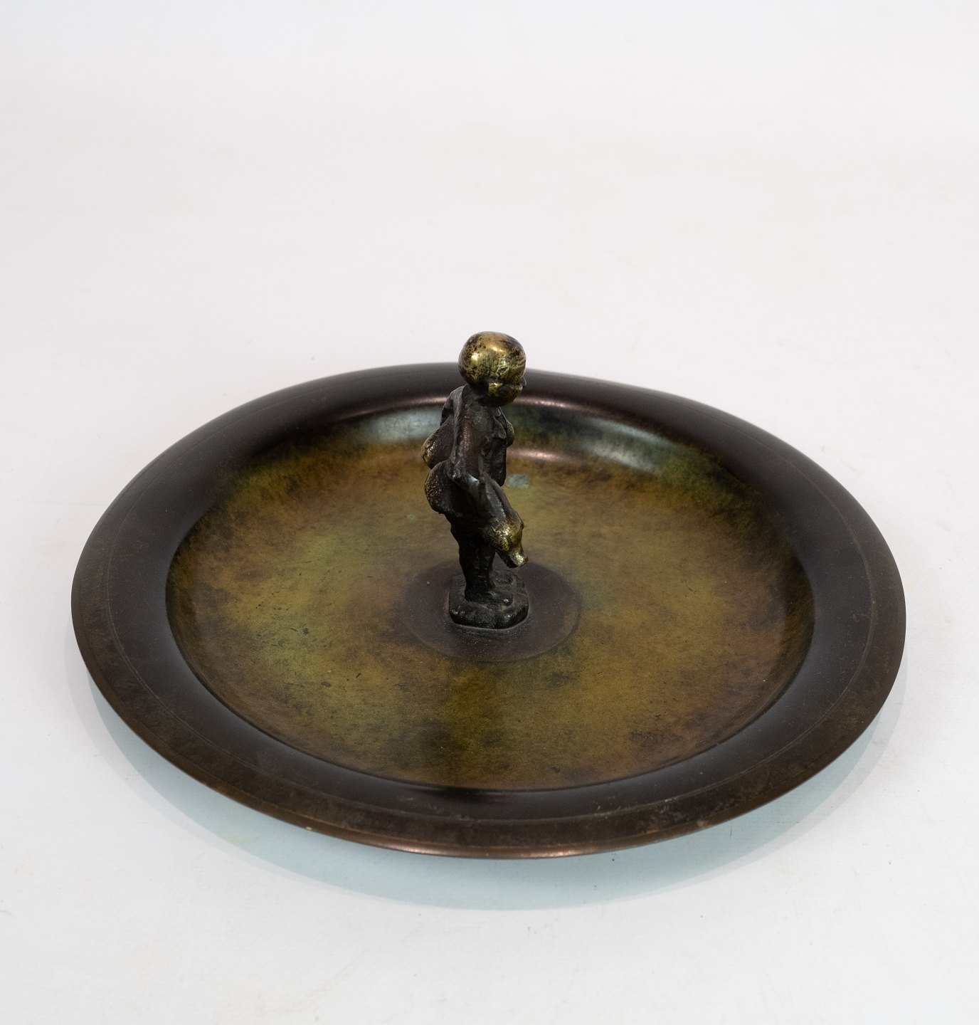 Rundt fad af bronze dekoreret med drengefigur. Fadet er i flot brugt stand.