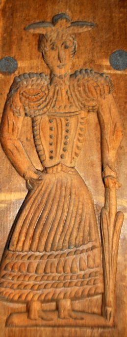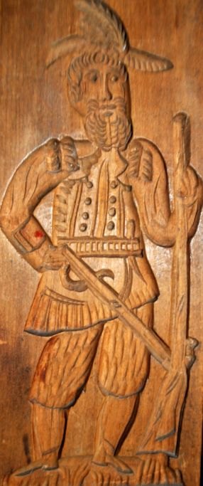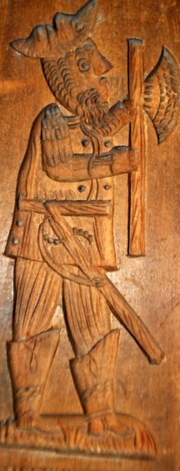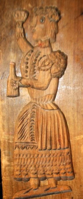 Antik spansk kageform, 19. årh. Hårdt træ. Med 4 udskårne figurer af jæger, soldat, spadserende kvinde og kvinde med flaske.  L.: 66 cm. B.: 12 cm.