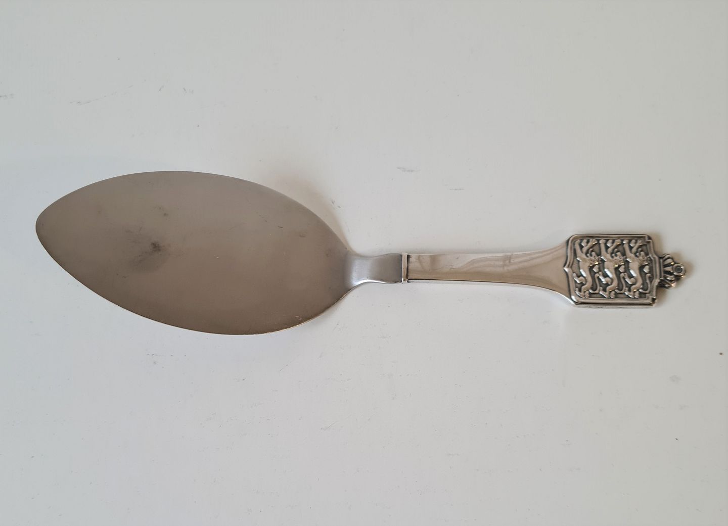Serveringsspade i sølv dekoreret med Danmarks rigsvåben produceret hos Cohr i 1944