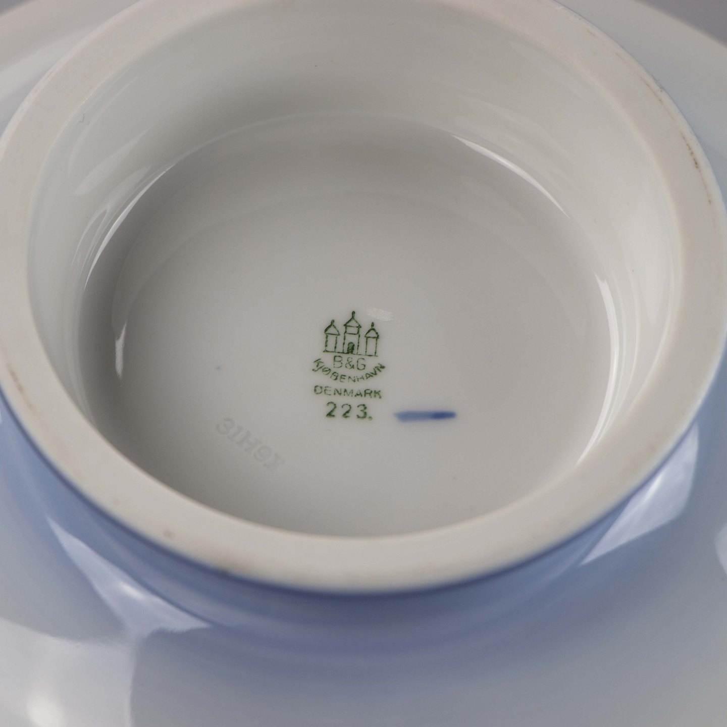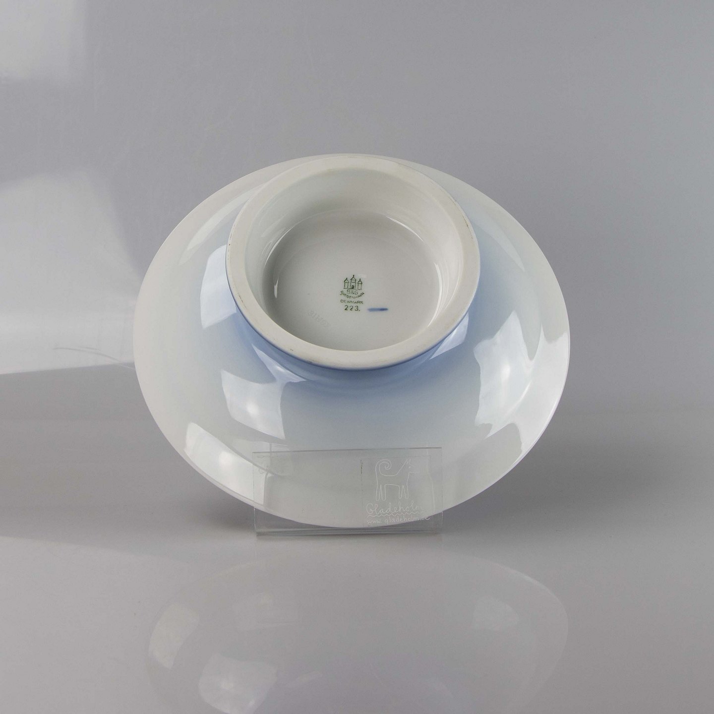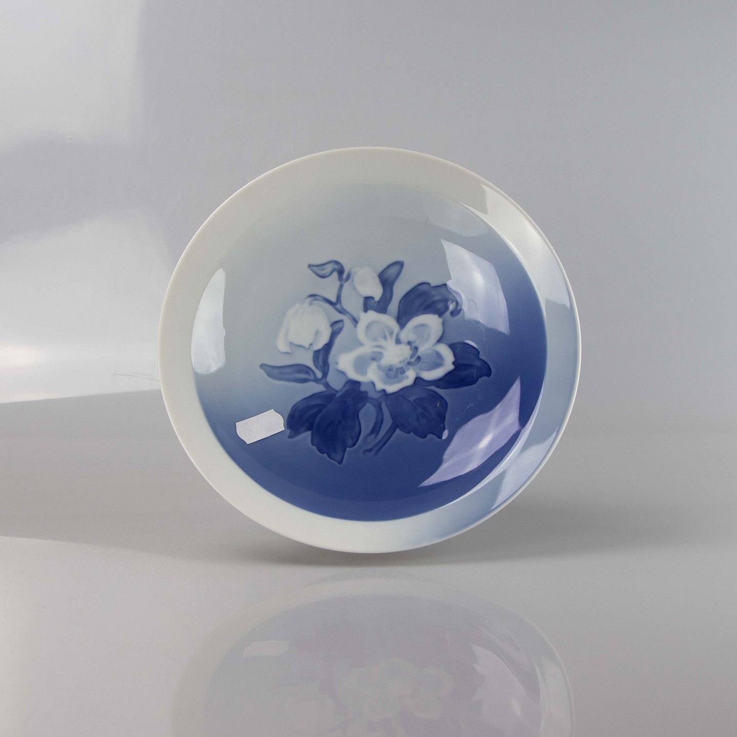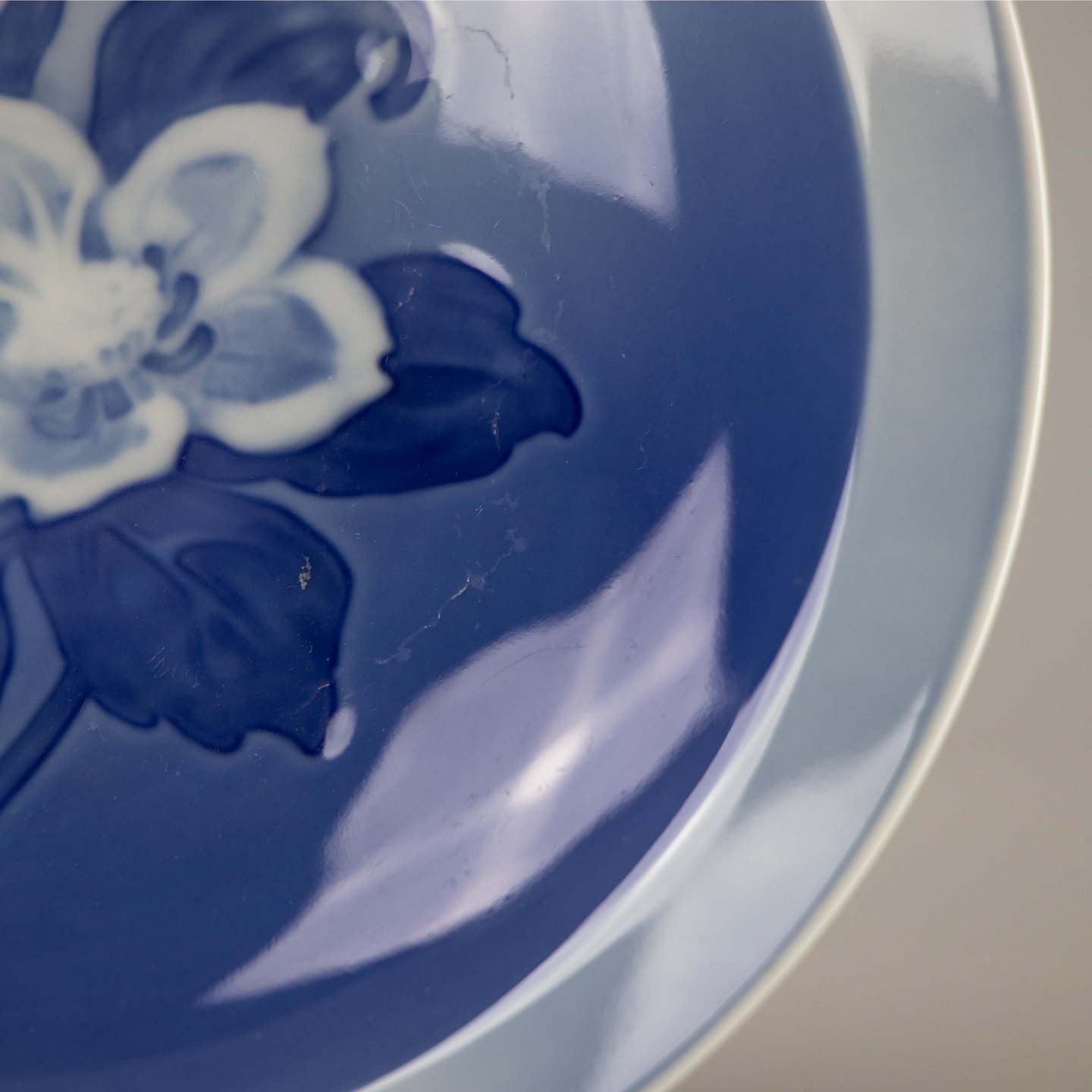 Kagefad i hvidt og gradueret blå porcelæn med motiv af julerose.