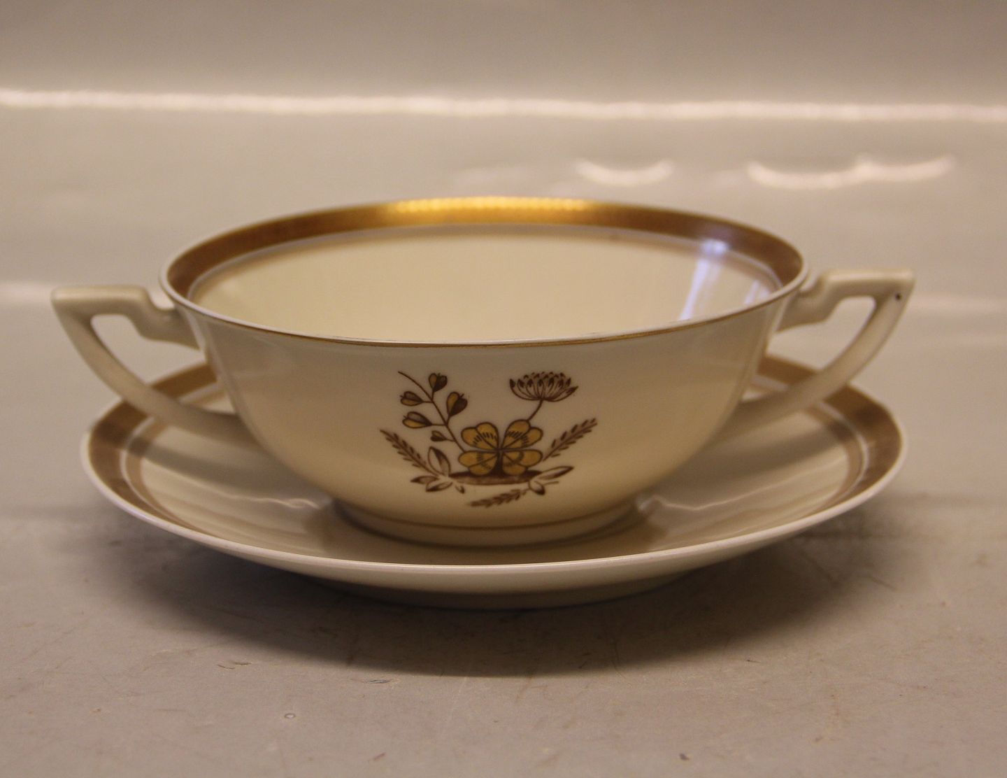 9571-947 Bouillon cup and saucer 17 cm Soup Cup Royal Copenhagen # 947 Tableware Gold encrusted rim, Gold Clover Flowers on Cream Base called Liselund Designed by Thorkild Olsen In nice and mint condition