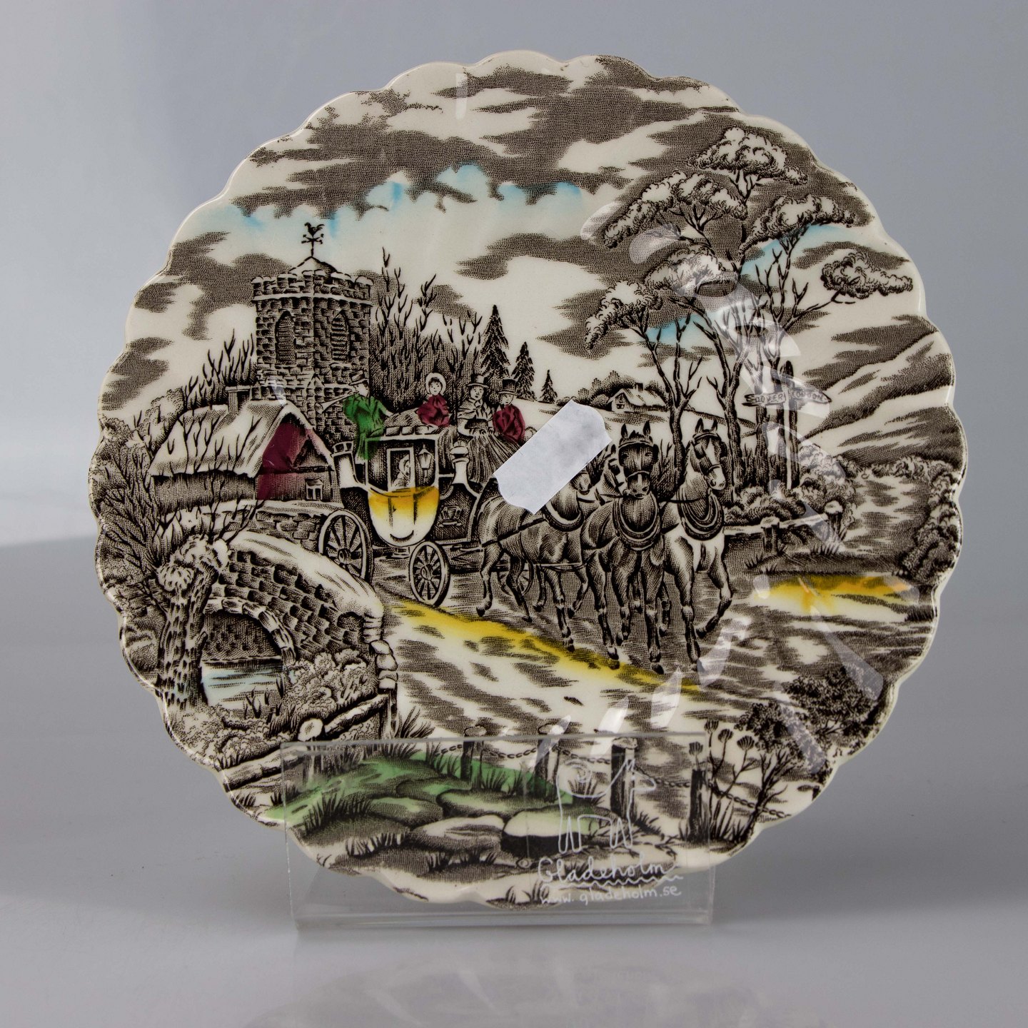 Tallerken i cremefarvet ironstone med multifarvet motiv af postvogn i landskab.